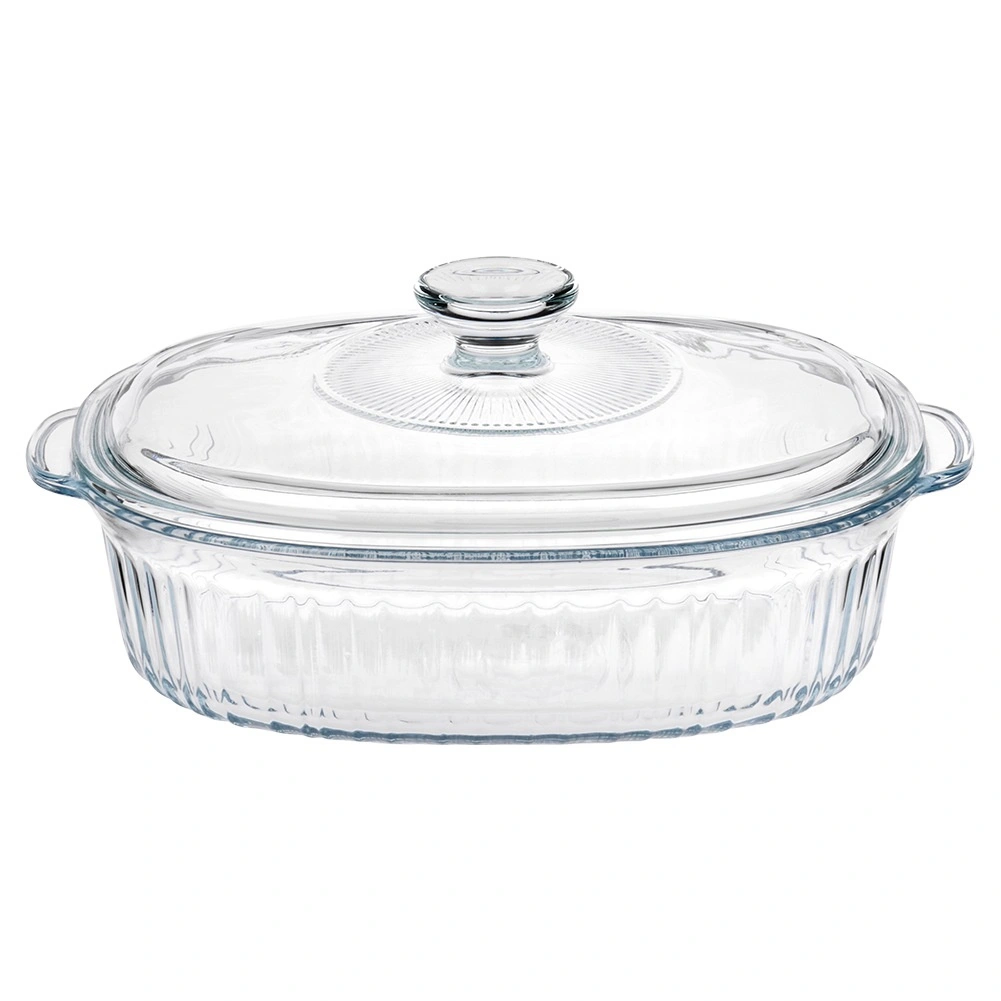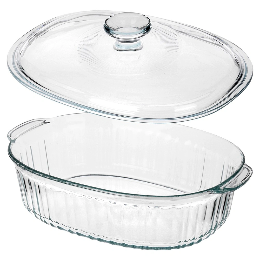 Tato oválná žáruvzdorná mísa z borosilikátového skla je ideální pro pečení, zapékání a servírování přímo na stůl. Transparentní sklo umožní snadno kontrolovat propečení a ryhované boky dodají styl i jistý úchop.