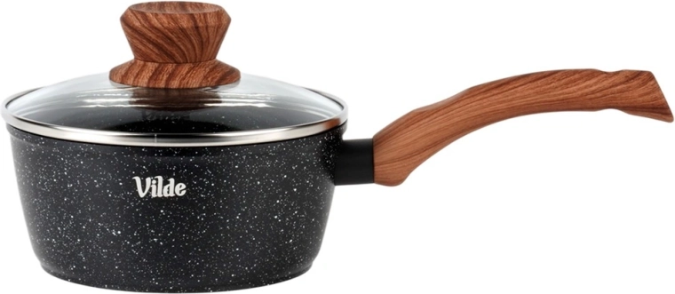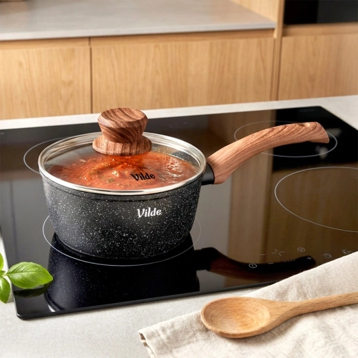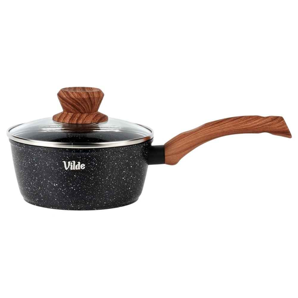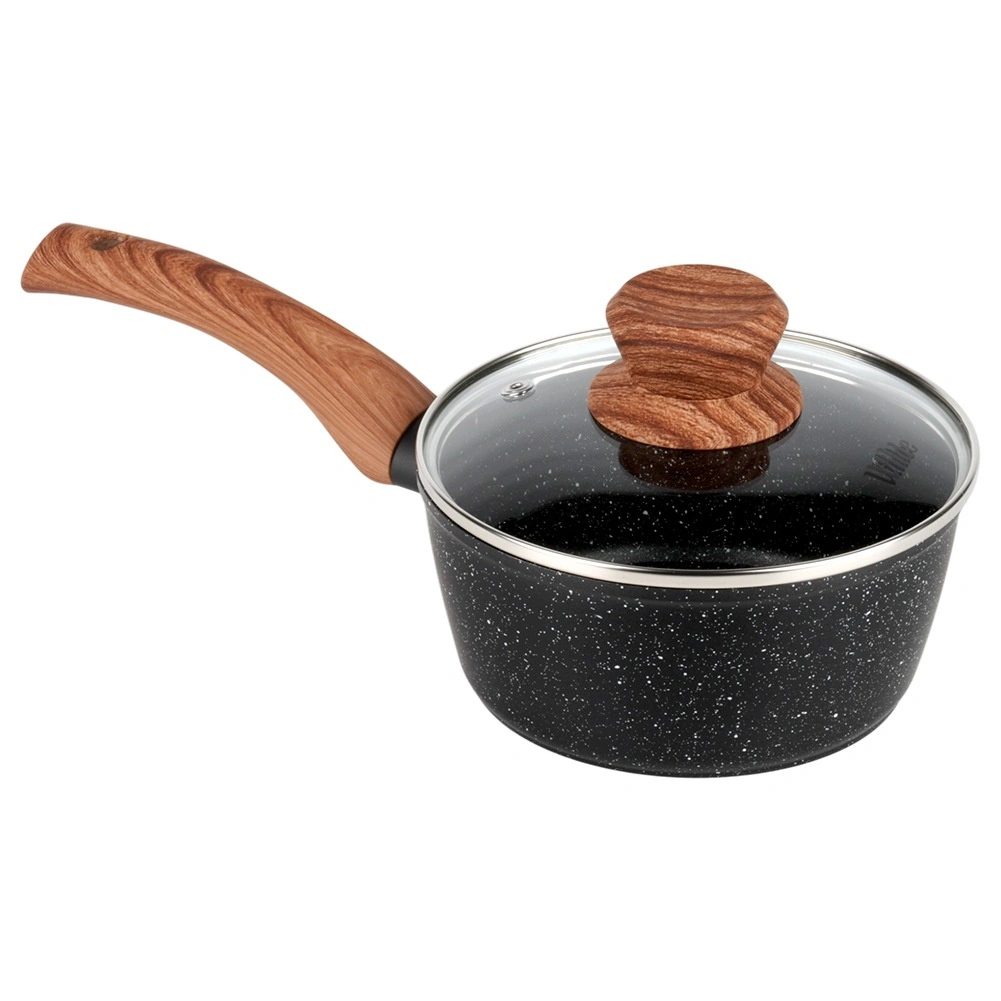 Praktický rendlík o průměru 16 cm a objemu 1,2 l z odlévaného hliníku s nepřilnavým granitovým povrchem a ergonomickou rukojetí soft touch v dekoru dřeva. Součástí je skleněná poklice s parním ventilem pro pohodlnou kontrolu vaření. Vhodný na indukci, plyn, elektřinu i keramiku a lze jej mýt v myčce.