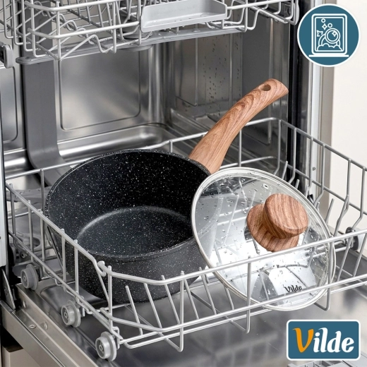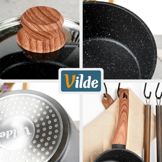 Odolné provedení z odlévaného hliníku výborně vede teplo, zatímco rukojeť se soft touch povrchem v dřevodekoru sedí jistě v ruce. Skleněná poklice s nerezovým okrajem a ventilem umožňuje kontrolovat proces bez zvedání a udržuje vlhkost i chuť.