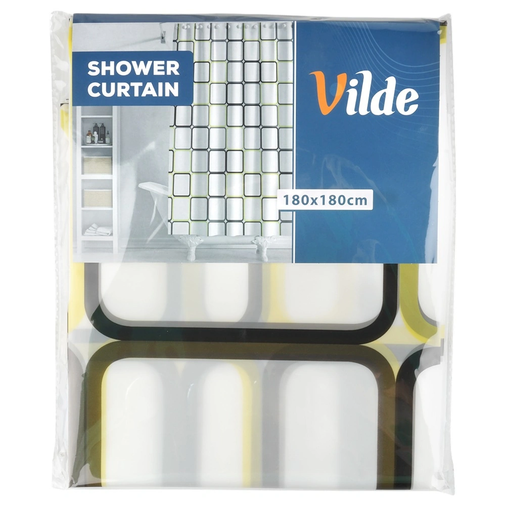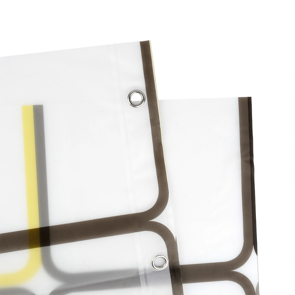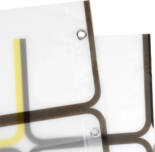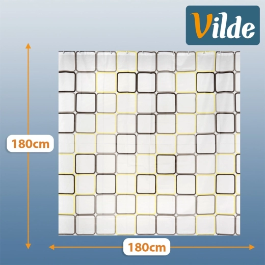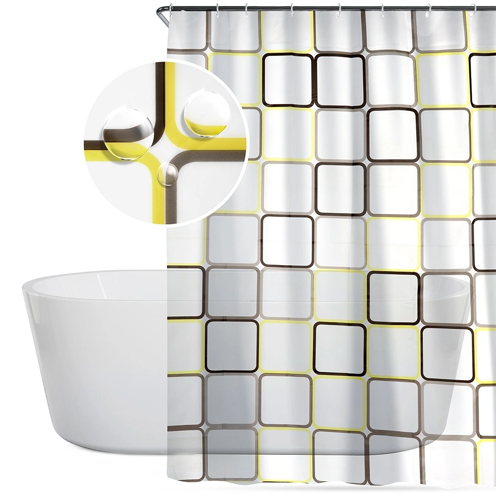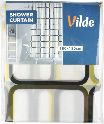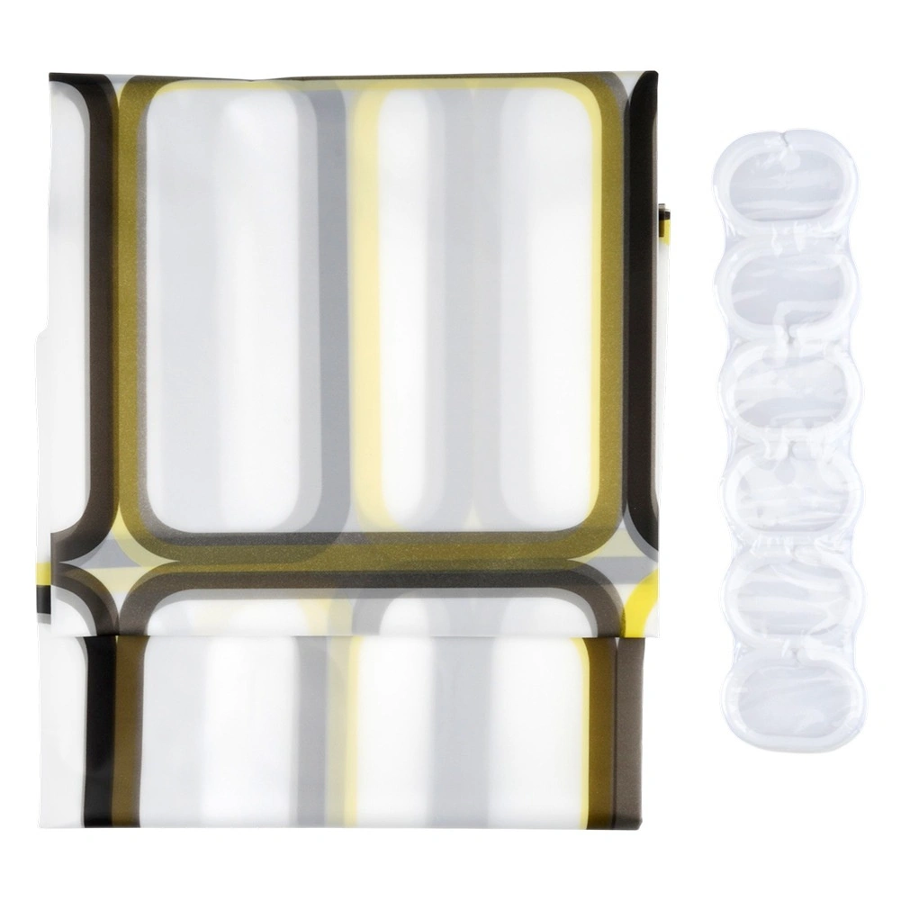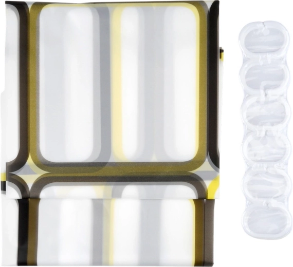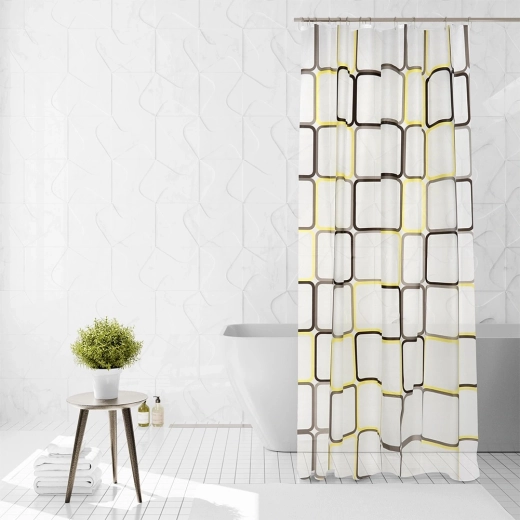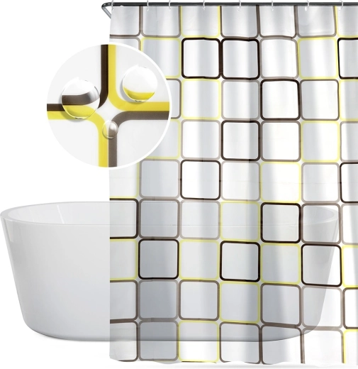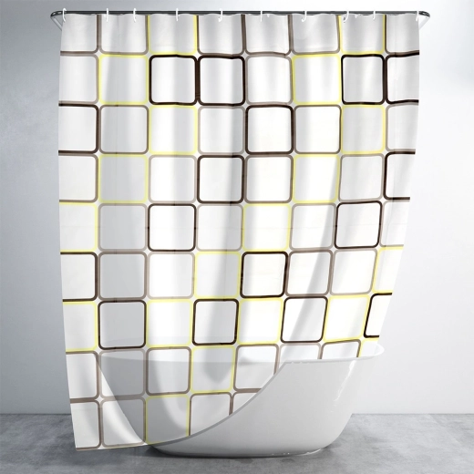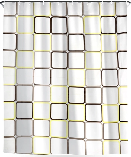Objevte praktické řešení pro každodenní koupelnu: sprchový závěs z materiálu PEVA, který je lehký, odolný a šetrný k životnímu prostředí. Polotransparentní bílý podklad s geometrickými čtverci v žlutých a hnědých tónech dodá interiéru svěží, moderní vzhled a zároveň zachová potřebné soukromí.