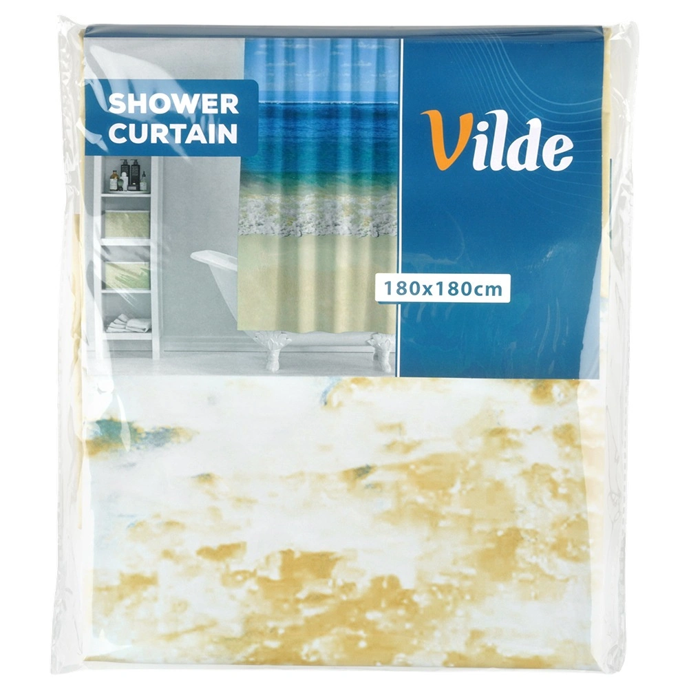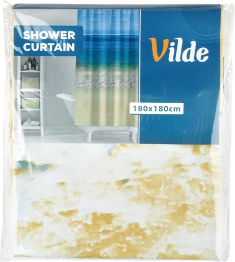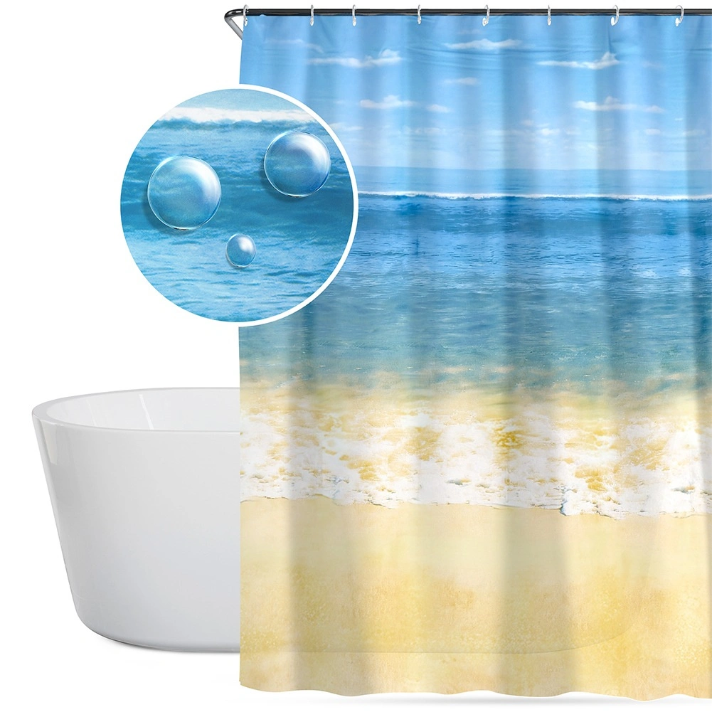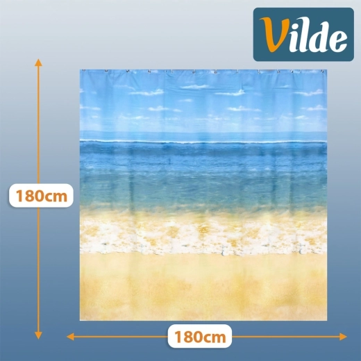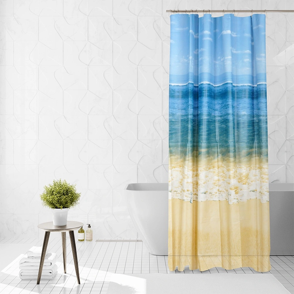 Stylový sprchový závěs s motivem pláže o rozměrech 180 × 180 cm se dodává včetně 12 háčků. Vyroben z ekologického materiálu PEVA, je voděodolný, snadno se čistí a poskytuje soukromí i spolehlivou ochranu proti stříkající vodě pro většinu van a sprchových koutů.