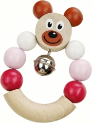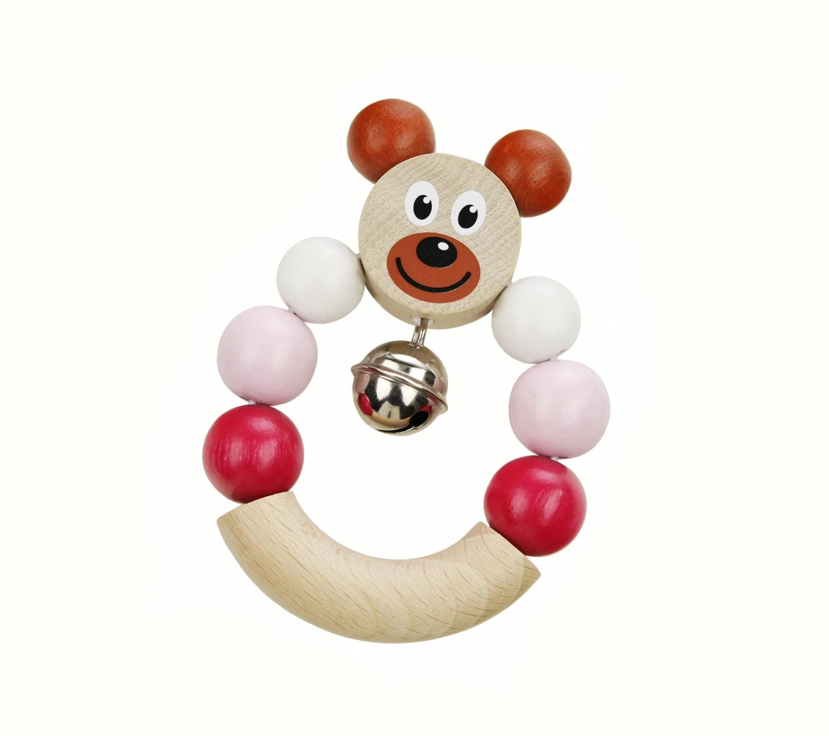 Roztomilé dřevěné chrastítko s medvídkem v růžové barvě potěší každé miminko. Integrovaná rolnička jemně cinká, chrastítko je lehoučké a díky kompaktním rozměrům 7 × 9 cm se skvěle drží v malých ručičkách. Výrobek splňuje přísné požadavky EU na bezpečnost hraček a pyšní se certifikátem Bezpečné hračky.