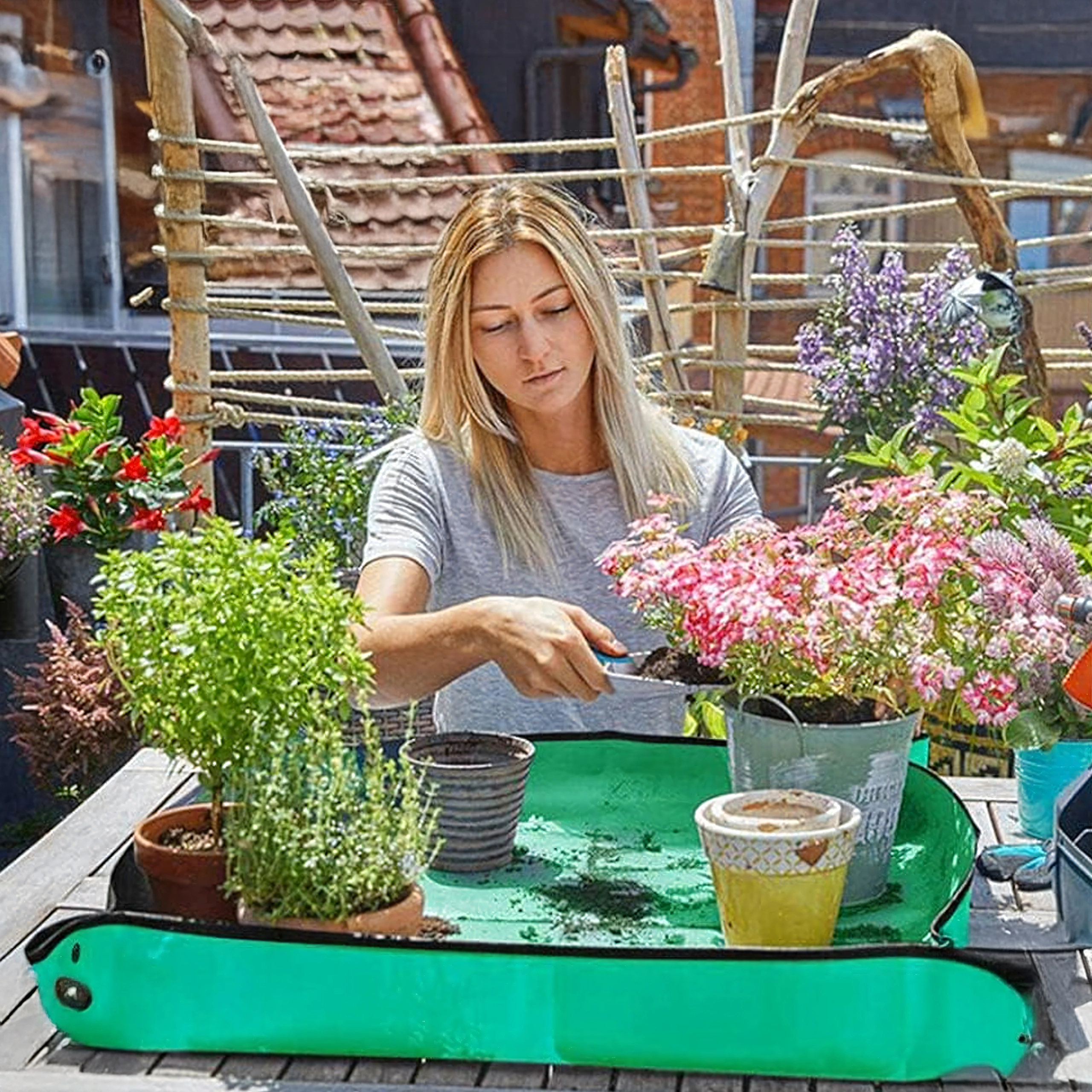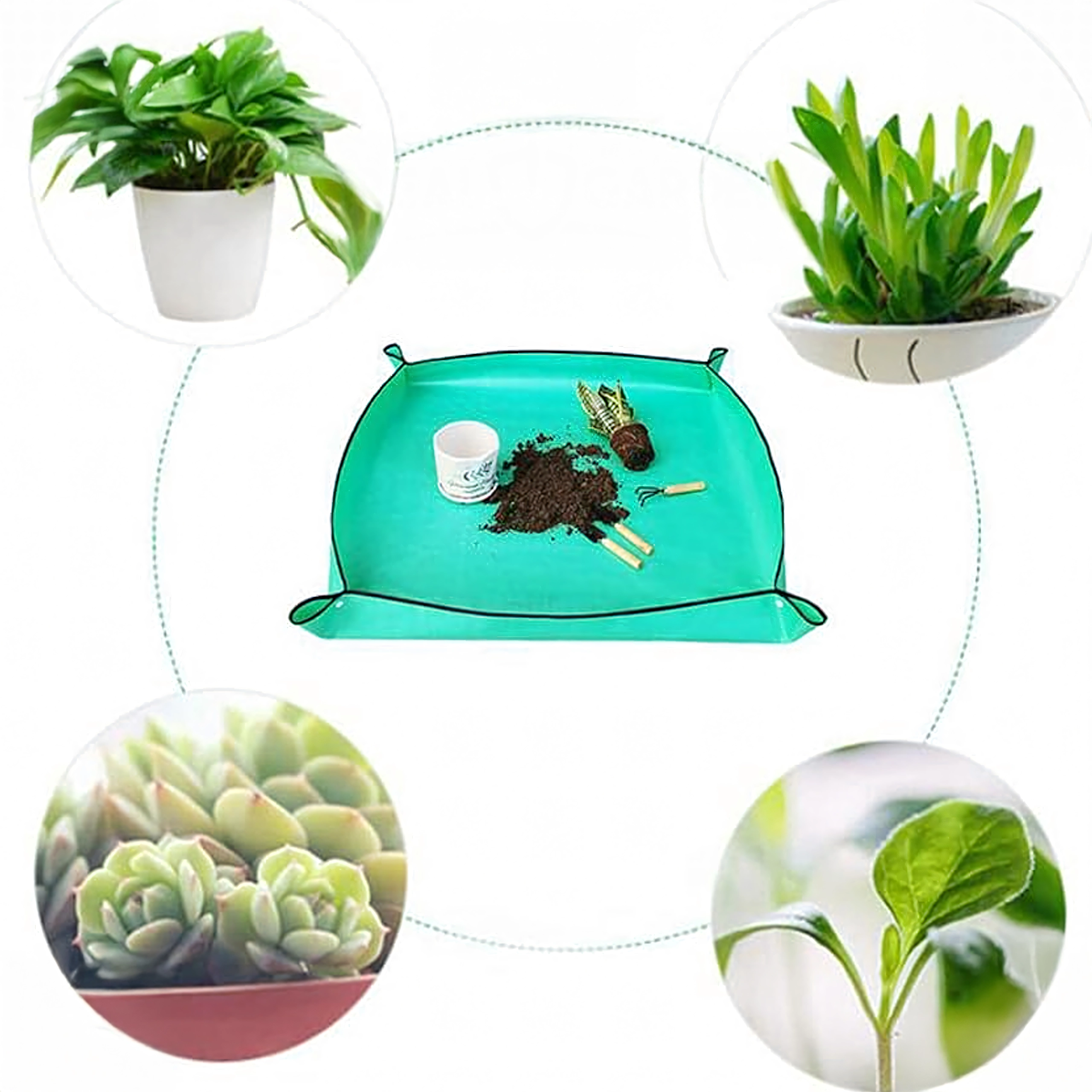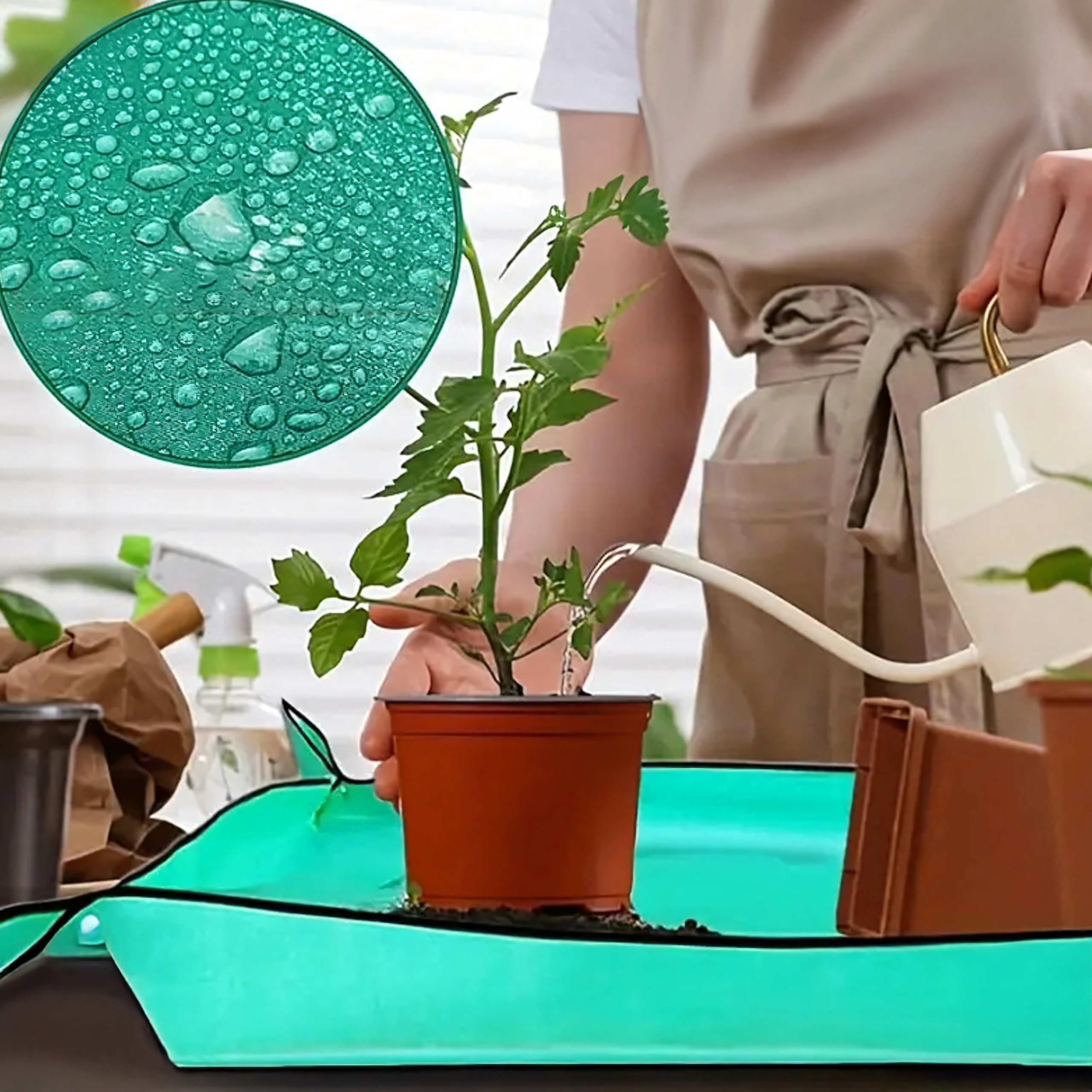 Skvěle se hodí pro přesazování pokojových rostlin, péči o sukulenty, míchání substrátu a práci s drobným nářadím. Podložka poskytuje stabilní, nepropustný pracovní povrch, chrání desky stolů a podlahy a udrží vše potřebné na dosah.