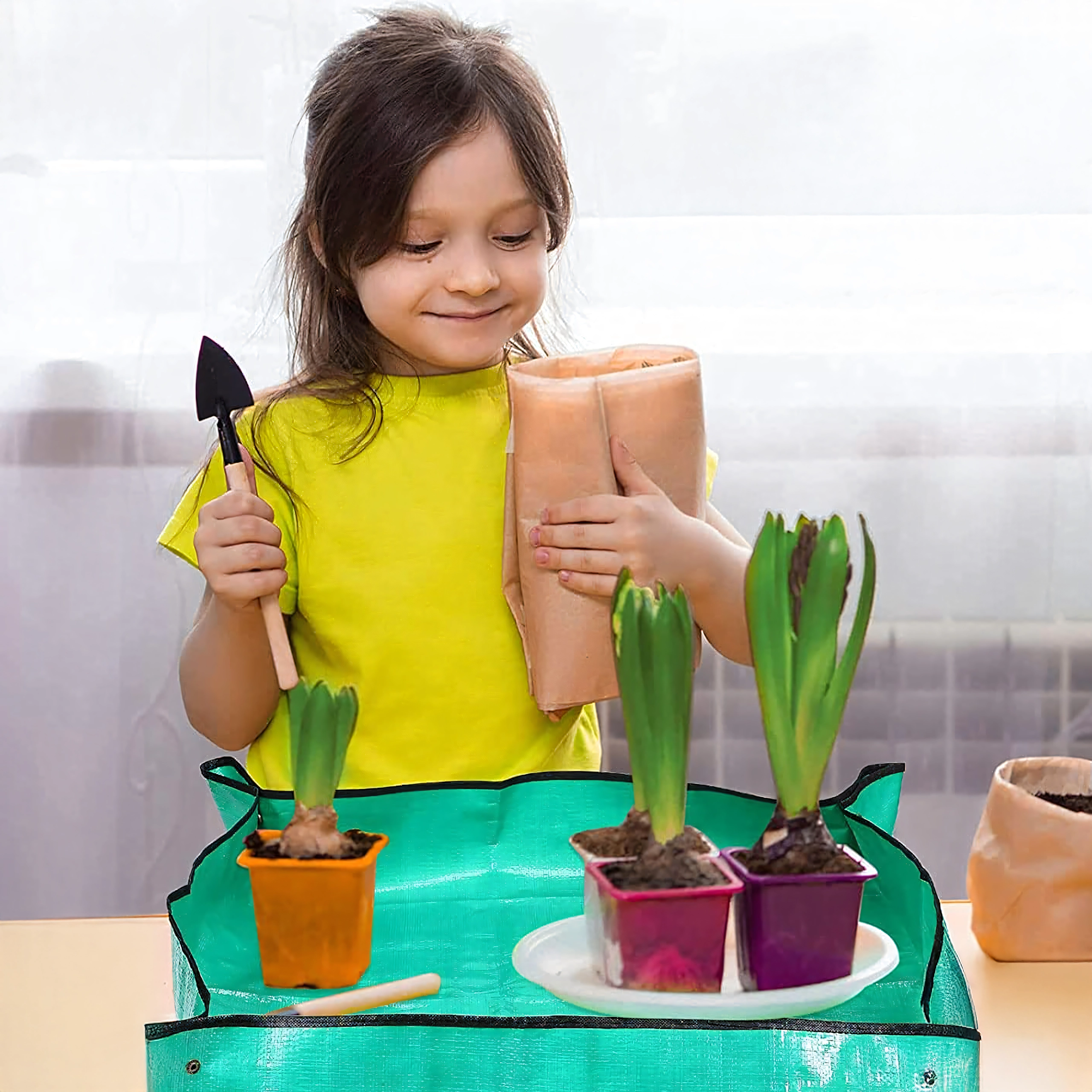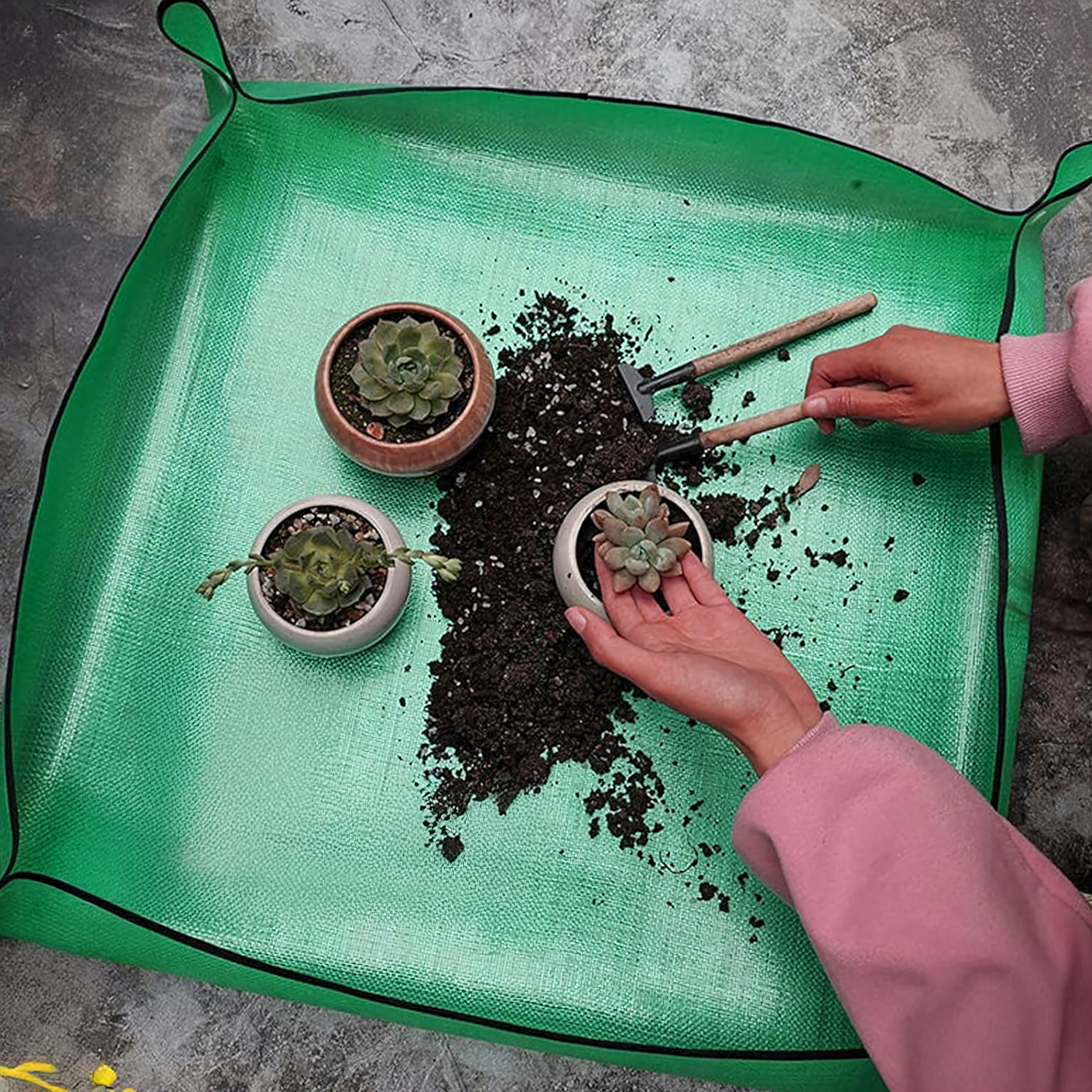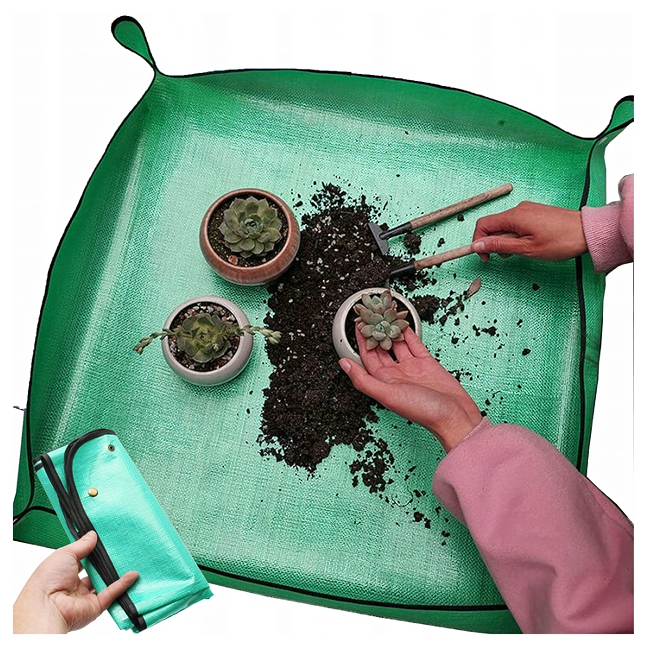 Skvěle se hodí pro přesazování pokojových rostlin, péči o sukulenty, míchání substrátu a práci s drobným nářadím. Podložka poskytuje stabilní, nepropustný pracovní povrch, chrání desky stolů a podlahy a udrží vše potřebné na dosah.