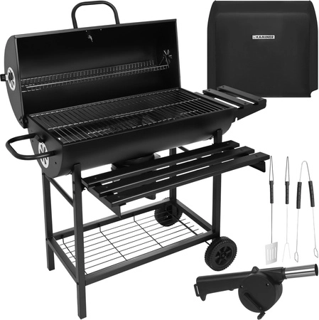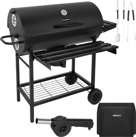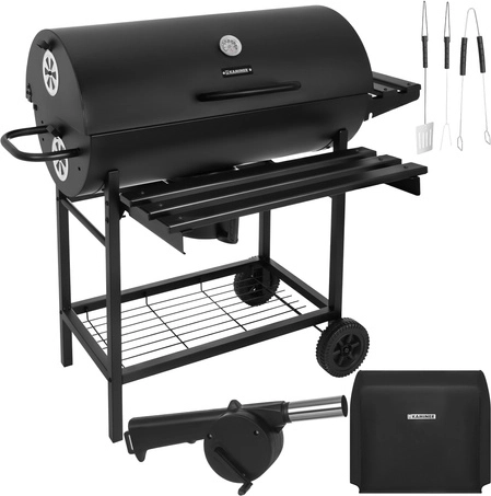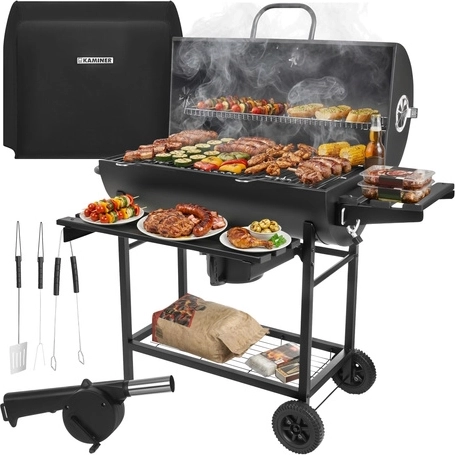 Robustní zahradní gril na dřevěné uhlí s víkem a vestavěným termometrem pro přesnou kontrolu teploty. Nabízí velkou grilovací plochu, chromované rošty (hlavní + ohřívací), nerezovou tác na uhlí a promyšlené proudění vzduchu pro stabilní žár. Součástí je pokrývka, nářadí, ruční ofuk a praktické police a háčky pro pohodlnou přípravu.
