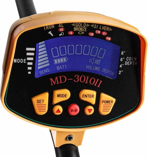 - Podsvícený LCD – kategorie kovů, citlivost, baterie, hloubka (indikace v palcích/centimetrech)