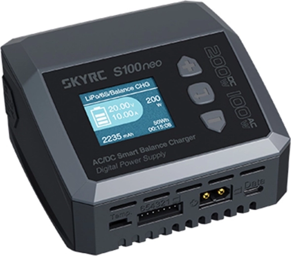 Kompaktní a výkonná nabíječka SkyRC S100neo pro RC a dílenské použití nabízí AC/DC napájení, až 200 W výkonu na DC a přesné vyvažování článků do 1000 mA. Podporuje širokou škálu akumulátorů (LiPo, LiHV, LiFe, LiIon, NiMH, NiCd, Pb), má přehledný 1,77" barevný displej a umí i digitální napájecí režim CC/CV.