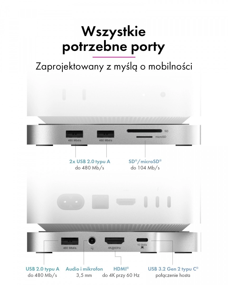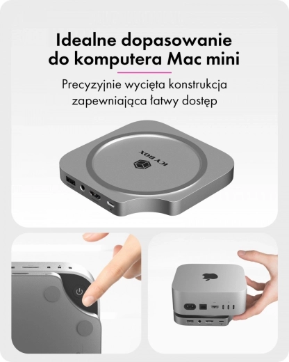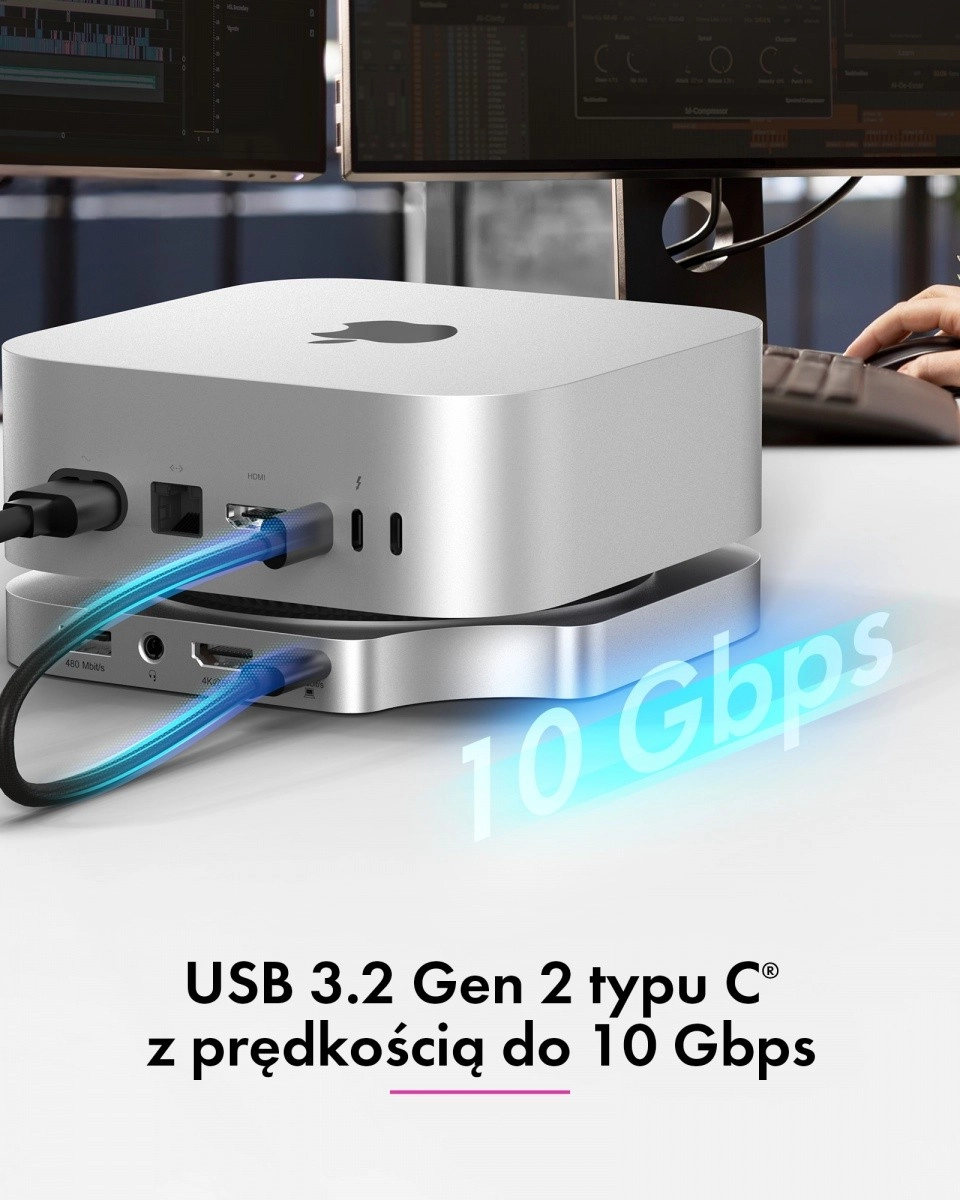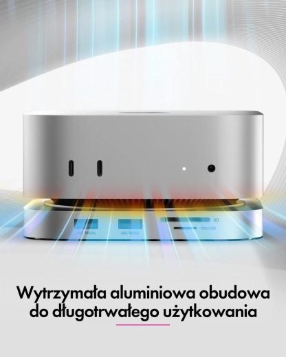 Dokovací stanice plynule navazuje na styl, rozměry i barevné ladění Macu mini M4, takže působí jako jeho nedílná součást. Uspořádá pracovní prostor, zlepší ergonomii a zpřístupní často používané porty přímo z čela stanice – rychle, přehledně a bez redukcí.