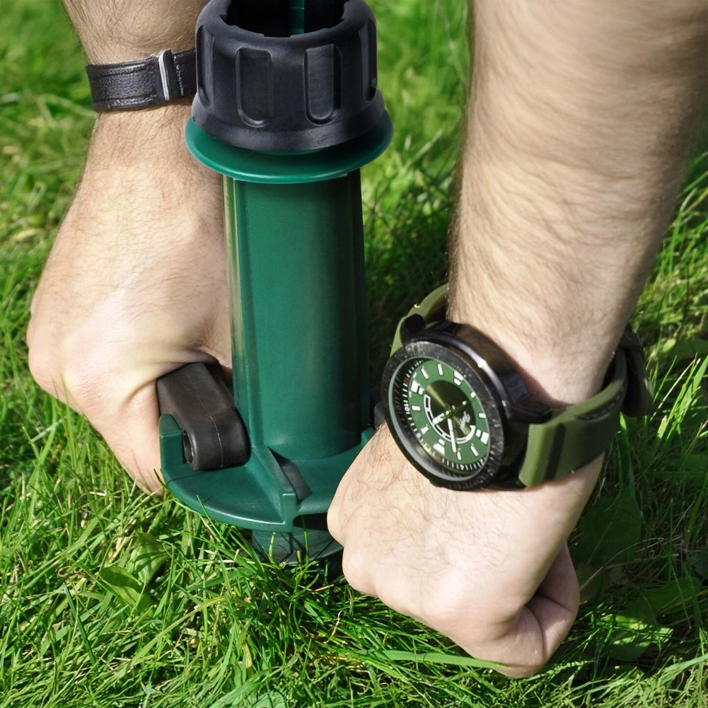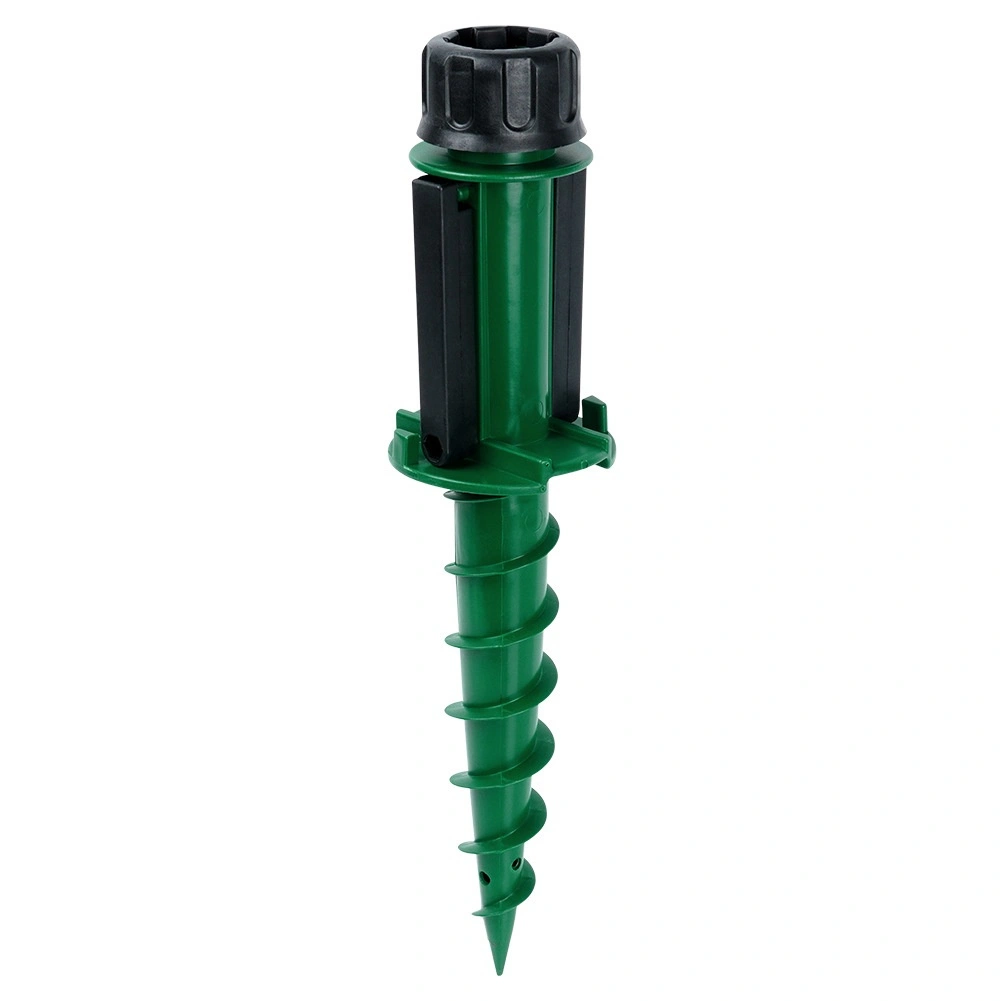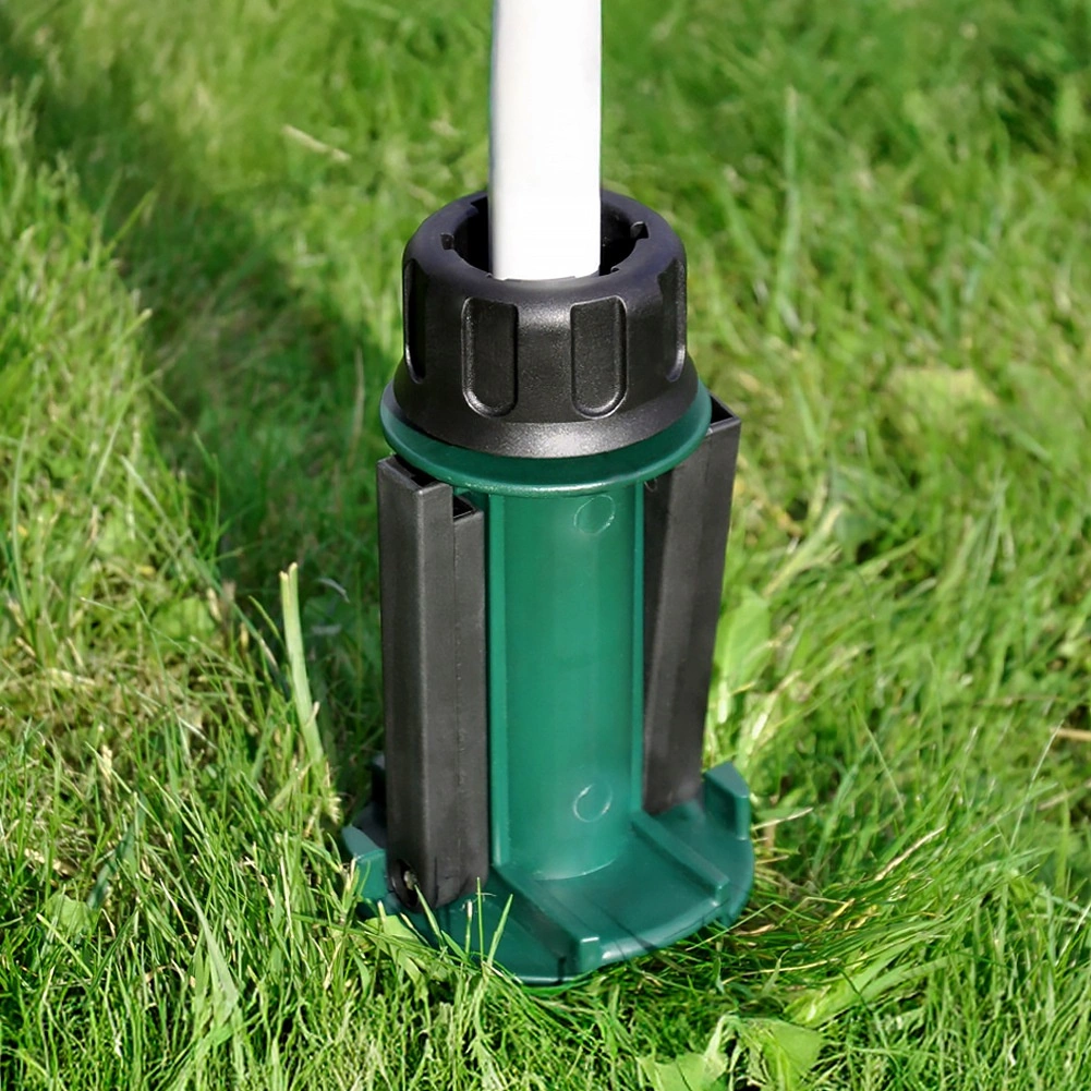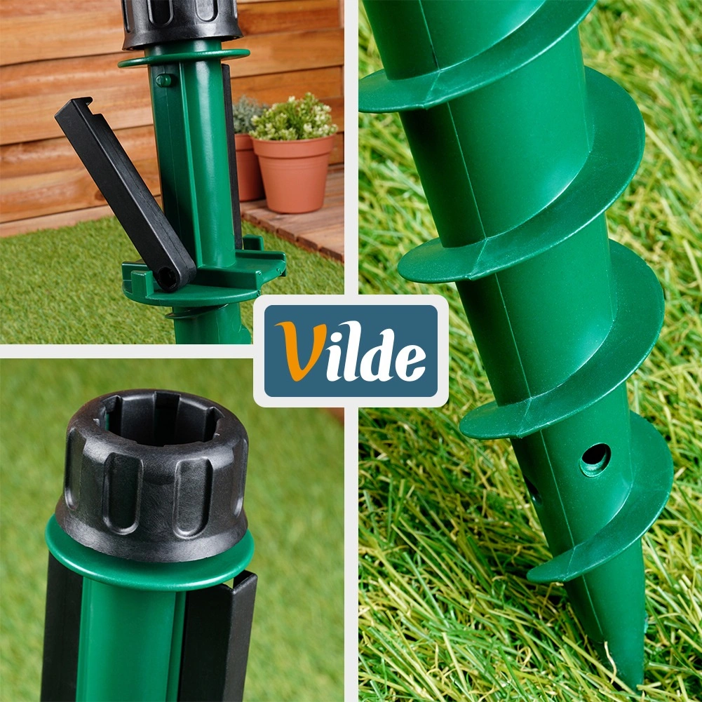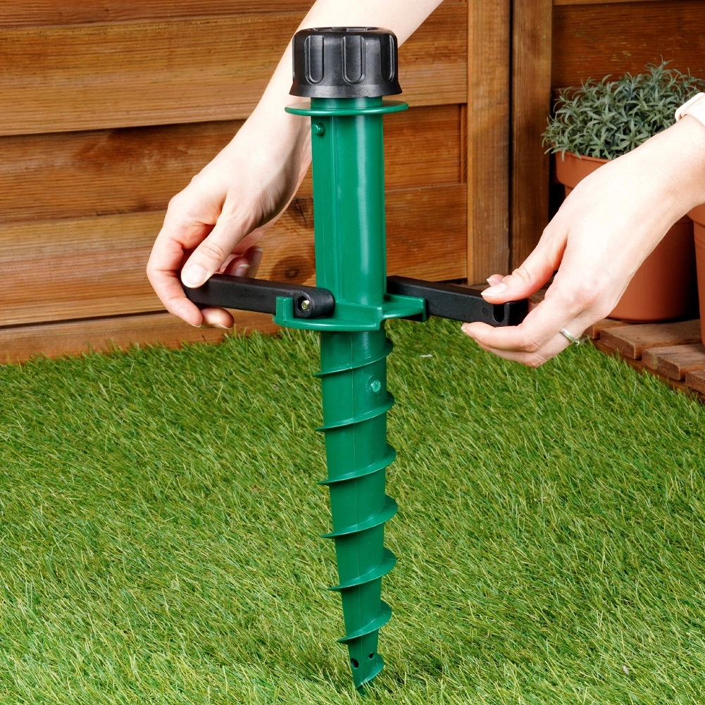 Vrchní dotahovací objímka se přizpůsobí běžným průměrům tyčí slunečníků (cca 2,2–3,3 cm) a udrží je bezpečně na místě. Boční výklopná madla poskytují páku pro jednoduché zašroubování i vyjmutí ze země. Ideální volba na zahradu, pláž, chatu i kempování – bez potřeby těžkých betonových podstav.