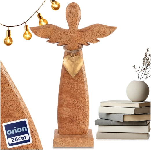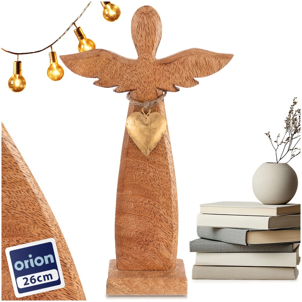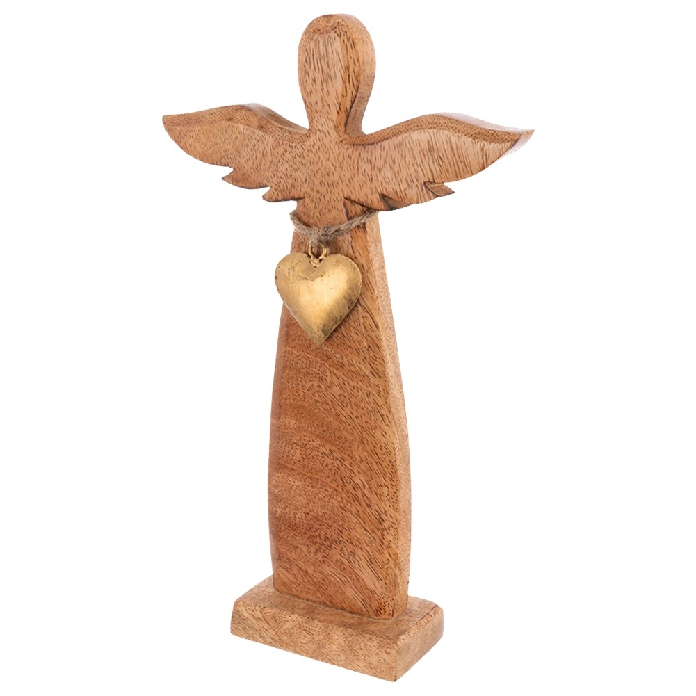 Elegantní dřevěná figurka anděla z přírodního dřeva manga s jemně vyřezanými křídly a závěsným srdcem ve zlaté barvě dodá interiéru přírodní kouzlo a útulnou atmosféru. Stylová dekorace na polici, komodu či stůl, ideální také jako originální dárek k výjimečným příležitostem.