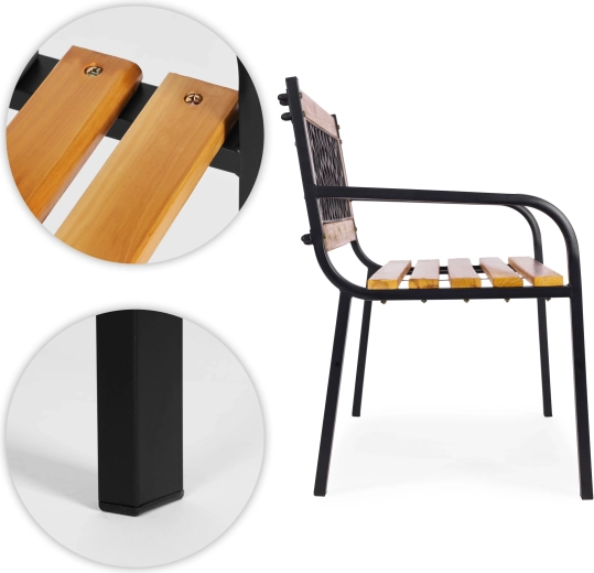 Robustní rám z práškově lakované oceli zajišťuje stabilitu, sedák z přírodního dřeva je příjemný na dotek a opatřený ochrannou vrstvou proti vlhkosti. Protiskluzové patky chrání povrch terasy a brání posunu lavice.