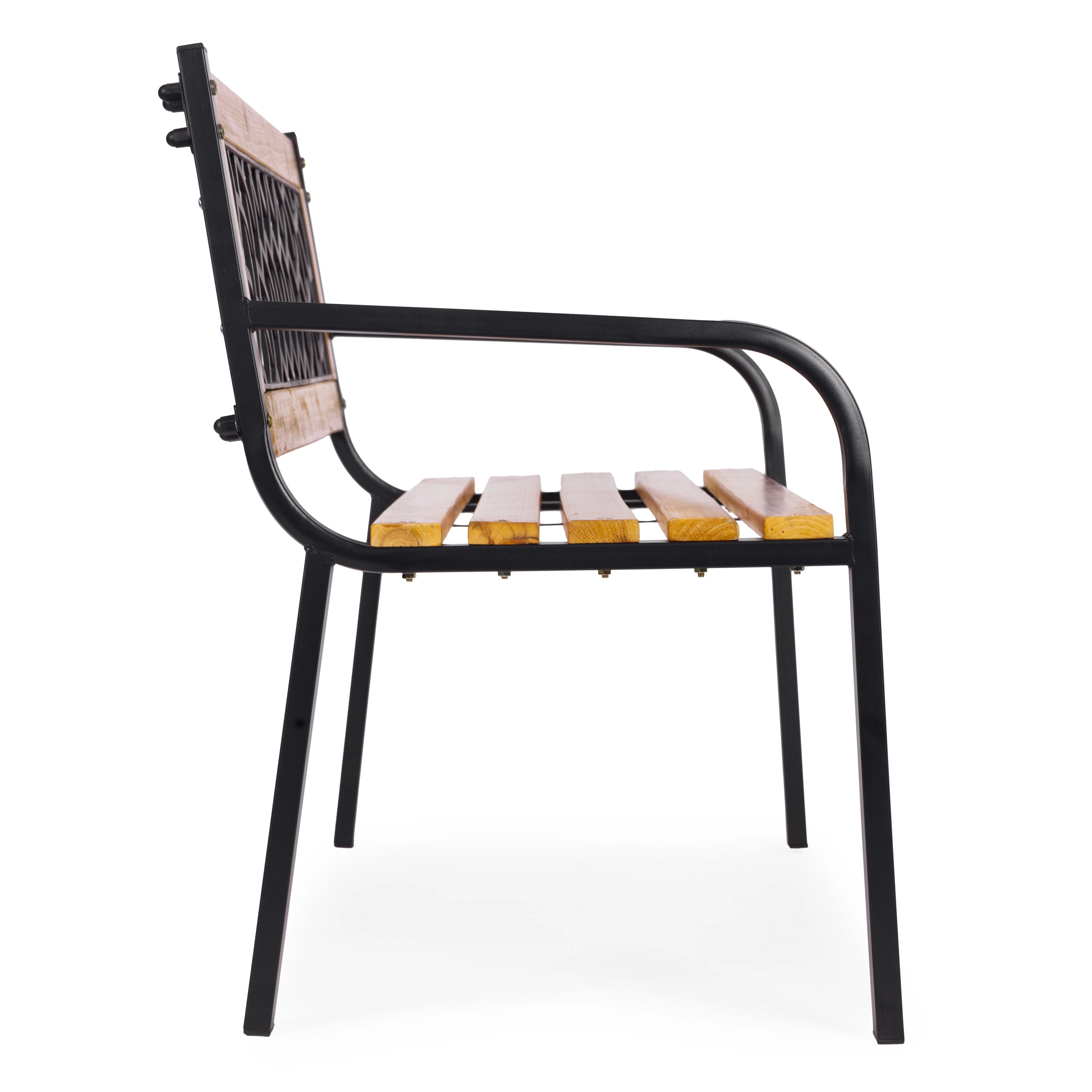 Stylová dřevěná zahradní lavice MULTIGARDEN kombinuje pevnou ocelovou konstrukci s přírodním dřevěným sedákem a vzdušným openwork opěradlem. Je odolná vůči povětrnosti, má protiskluzové koncovky nohou a unese až 260 kg – ideální na zahradu, terasu i balkon.