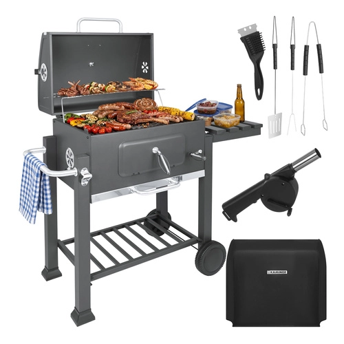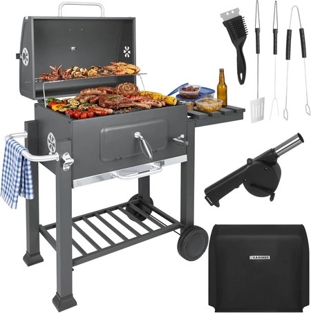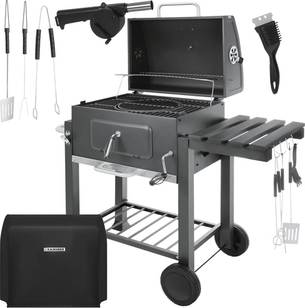 Nerezová miska na uhlí, vysouvací popelník, boční stolek, spodní police a bohaté příslušenství včetně obalu a BBQ náčiní pro pohodlné grilování.