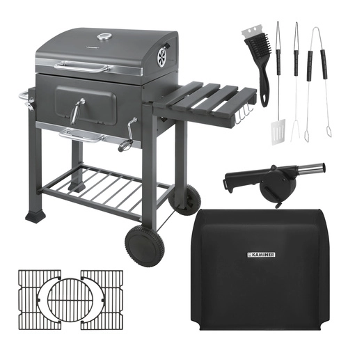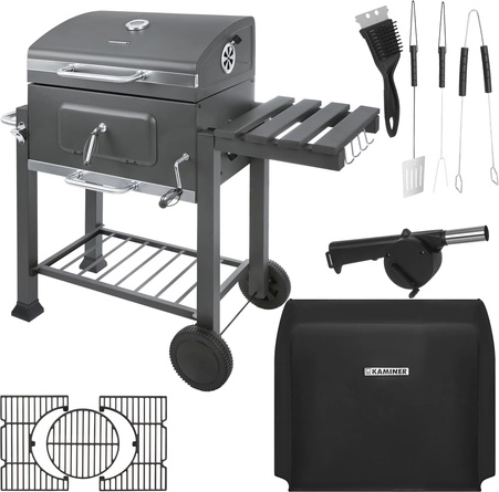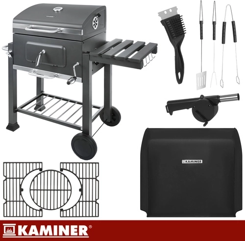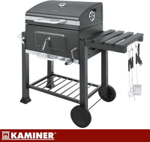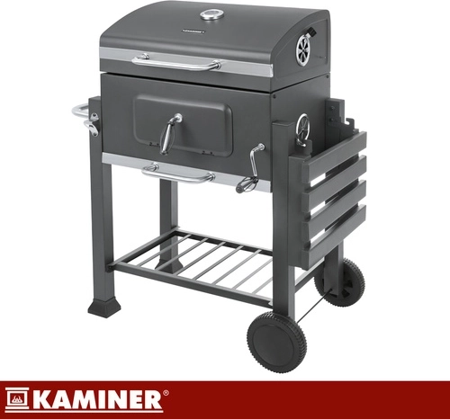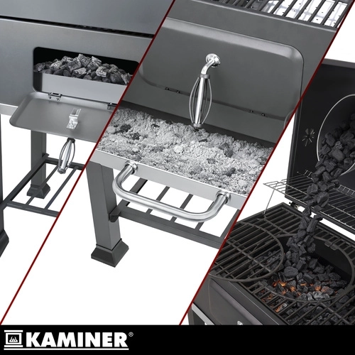 Robustní zahradní gril KAMINER s víkem a vestavěným termometrem nabízí litinový, emalovaný 3dílný rošt, nastavitelnou výšku paleniště pomocí kliky a nerezovou uhlíkovou misku pro delší životnost. Díky silnému 1mm plechu lépe drží teplo, teplota se řídí přesnými ventilacemi s komínkem a o komfort se stará horní teplovací rošt, boční stolek a spodní police. V balení nechybí ochranný obal a sada BBQ náčiní.