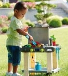 Užijte si realistickou hru na vaření s tímto dětským plynovým grilem se stolečkem na kolečkách a víkem. Součástí je bohaté příslušenství včetně maket potravin, plynové láhve, mlýnku se solí, olivového oleje, bazalky v květináči a nádobí. Mobilní konstrukce, snadné ovládání a spousta doplňků pro kreativní hru doma i na zahradě.