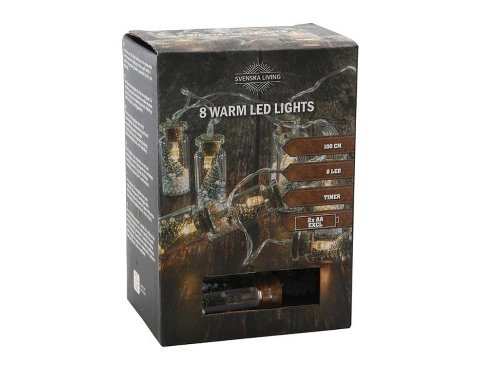 Elegantní světelný řetěz s lahvičkami a stromkem rozzáří váš domov po celý advent i zbytek roku. Nabízí teplé bílé světlo, 8 LED diod, praktický časovač 6/18 h a napájení na baterie 2× AA pro pohodlné a bezpečné použití v interiéru.
