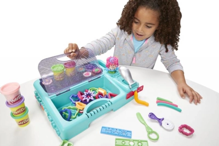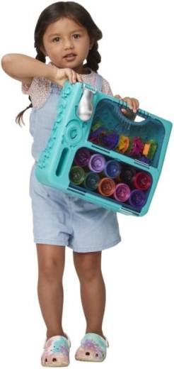 Přenosné studio Play‑Doh Super dílna dá dětem vše, co potřebují pro tvoření doma i na cestách. Odklápěcí tyrkysový kufřík s rukojetí udrží kelímky i nástroje přehledně pohromadě, takže je úklid i přenášení hračka. Vestavěná Fun Factory vytlačuje 9 hravých tvarů, které inspirují k neomezené fantazii.
