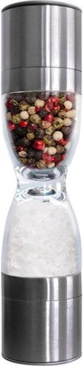 Praktický dvojitý ruční mlýnek TORO ve tvaru přesýpacích hodin umožňuje samostatně mlít sůl i pepř na protilehlých stranách. Nabízí krytky proti sypání, odolné nerezové provedení a kompaktní rozměry pro každodenní používání v kuchyni.