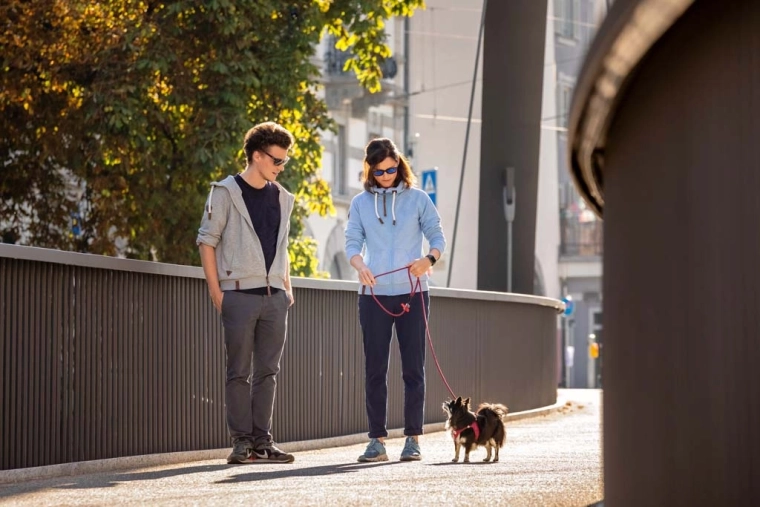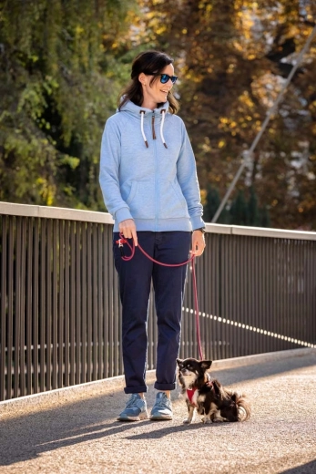 Intuitivní step‑in design umožní snadné nasazení a sundání. Polstrovaná spona chrání srst před skřípnutím, pevné materiály zvládnou tah až 100 kg a reflexní prvky zvyšují viditelnost za šera. V létě postroj jednoduše namočte do studené vody pro příjemné ochlazení. Nechybí DogFinder ID pro online registraci, která pomůže při ztrátě psa.