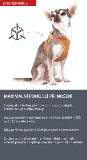 Objevte prémiový postroj CURLI z inovativní jablečné kůže – rostlinného hybridního materiálu vyrobeného z vedlejších produktů jablečné šťávy. Je ještě měkčí než běžná zvířecí kůže, výborně dýchá díky perforaci a poskytuje výjimečné pohodlí i citlivým pejskům. Minimalistický design v hnědé barvě a lehoučká konstrukce zajistí, že váš pes bude mít volnost pohybu a vy spolehlivé ovládání na vodítku.