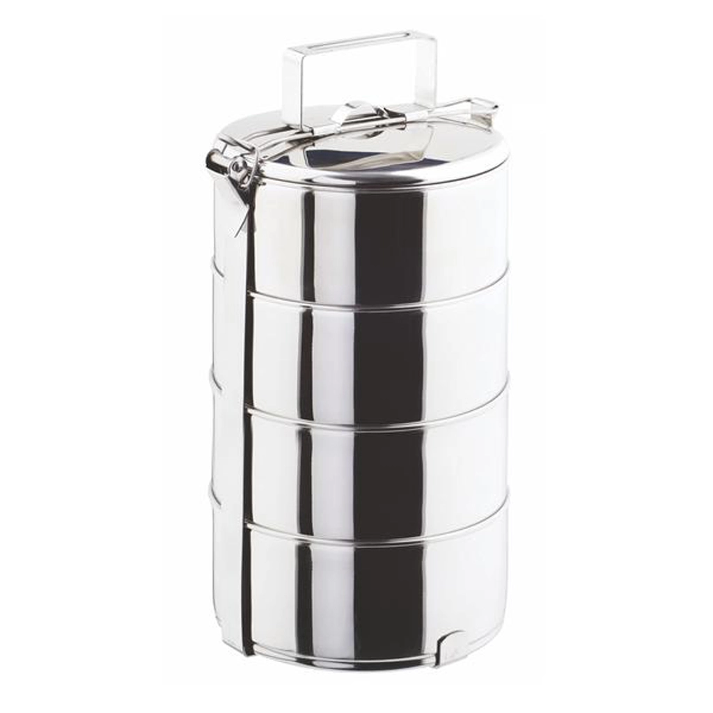 Praktický nerezový jídlonosič TORO se čtyřmi patry je ideální pro přenášení a uchovávání hotových jídel. Nabízí celkový objem 5 l (4 × 1,25 l), čtyři samostatné misky o průměru 16 cm a výšce 6,7 cm, pevné kovové spojení a snadnou údržbu v myčce.