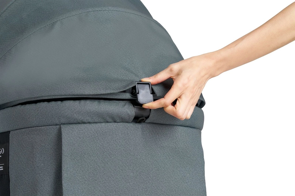 Integrovaný zámek rámu udrží kočárek bezpečně zavřený při přenášení a skladování.