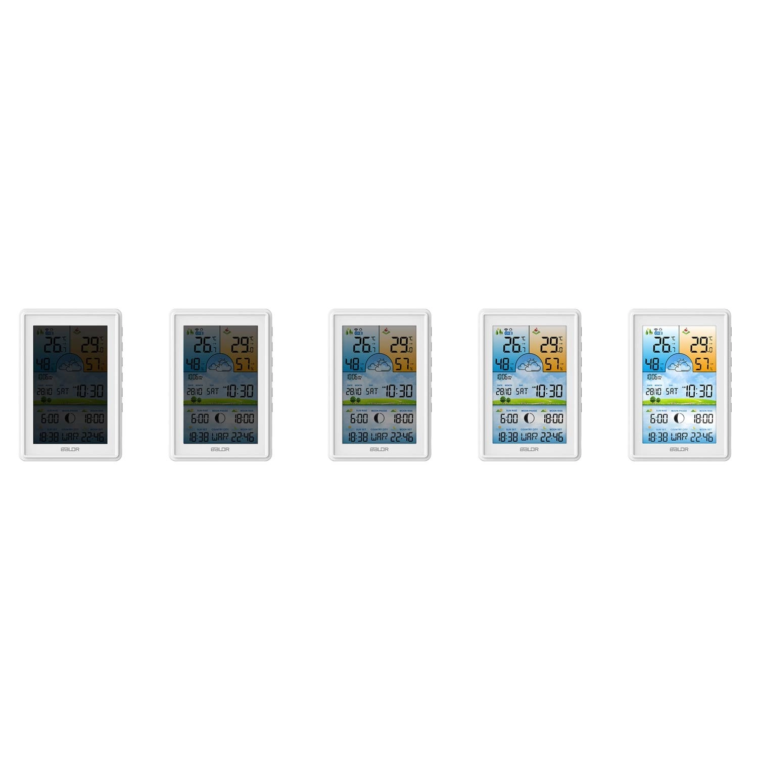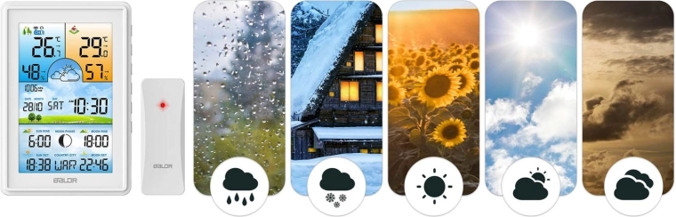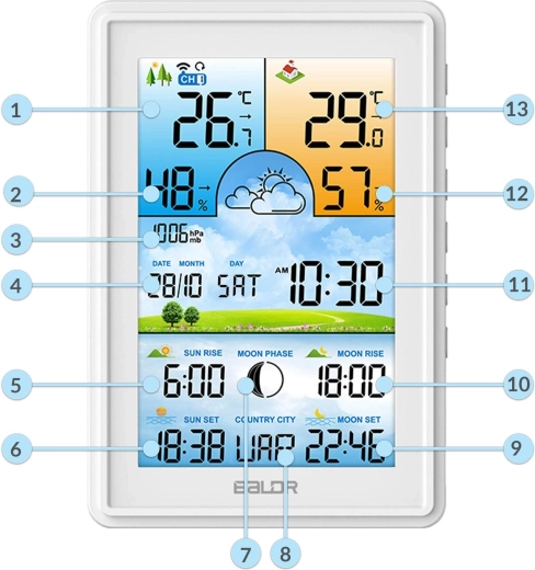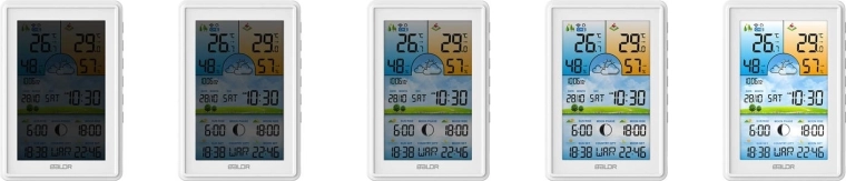 Velký, vícebarevně segmentovaný displej zobrazuje současně vnitřní i venkovní teplotu, vlhkost, čas, datum, fáze Měsíce a ikony předpovědi. Čtyři úrovně podsvícení pro pohodlné čtení ve dne i v noci.
