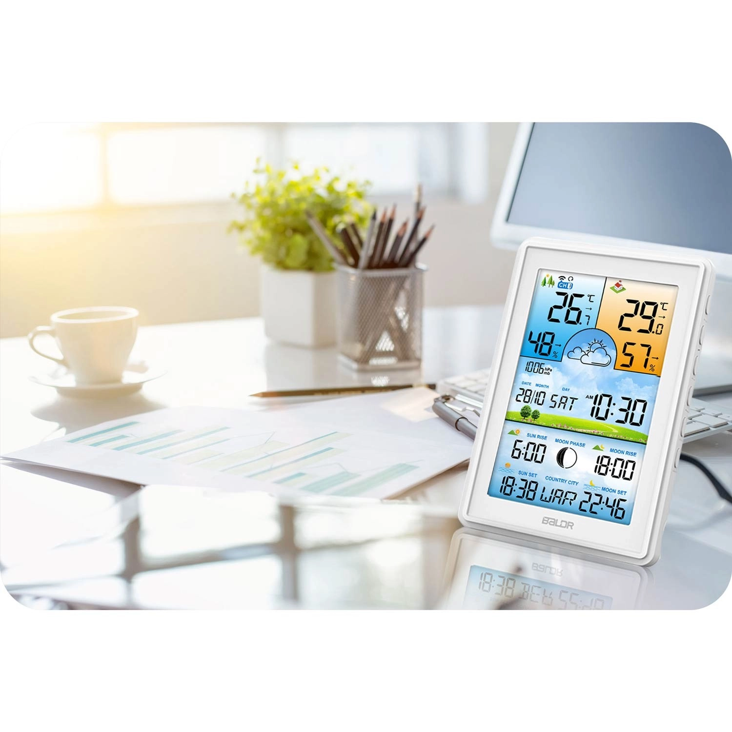 Moderní bezdrátová meteostanice s barevným LCD displejem a automatickou synchronizací času DCF77 přináší předpověď na 12–24 hodin, přesné měření teploty a vlhkosti uvnitř i venku, barometr, východ/západ Slunce a Měsíce, fáze Měsíce a budík. Díky čtyřúrovňovému podsvícení a přehlednému rozhraní snadno udržíte ideální klima doma i na zahradě.