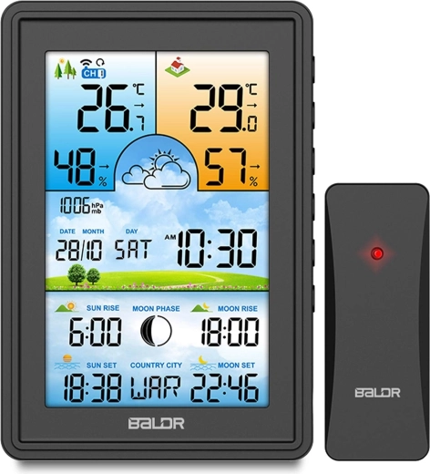 Stylová digitální meteostanice s bezdrátovým čidlem nabízí přesnou předpověď na 12–24 hodin, měření teploty a vlhkosti uvnitř i venku, barometr, DCF77 synchronizaci času a čas východu/západu Slunce i Měsíce. Přehledný barevný LCD displej s 4 úrovněmi podsvícení, alarm mrazu a teplotní alarm zajistí pohodlné a bezpečné používání doma i na zahradě.