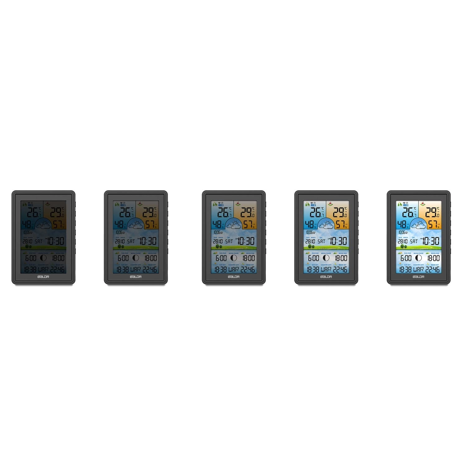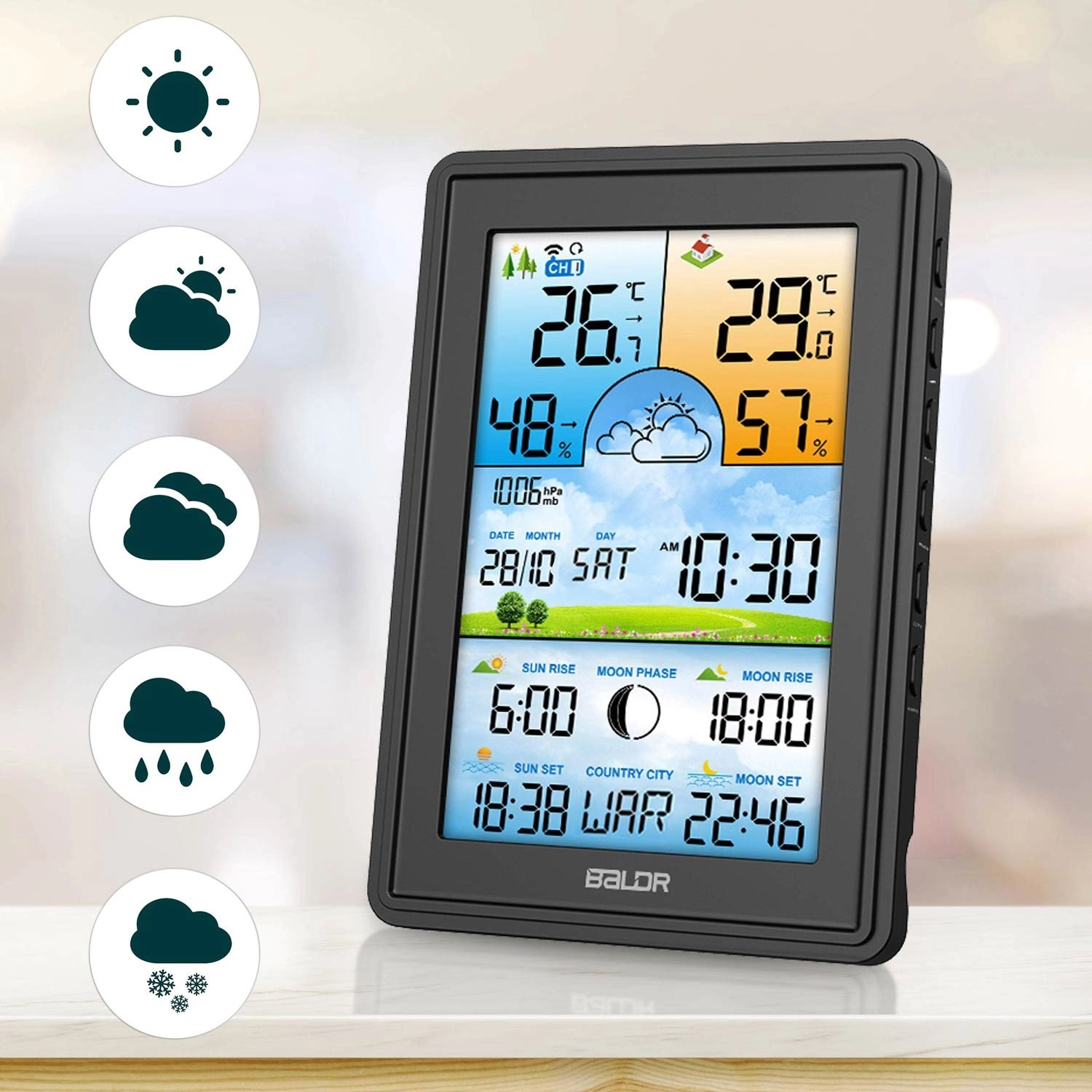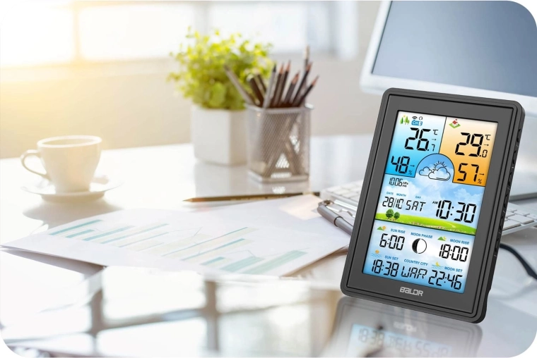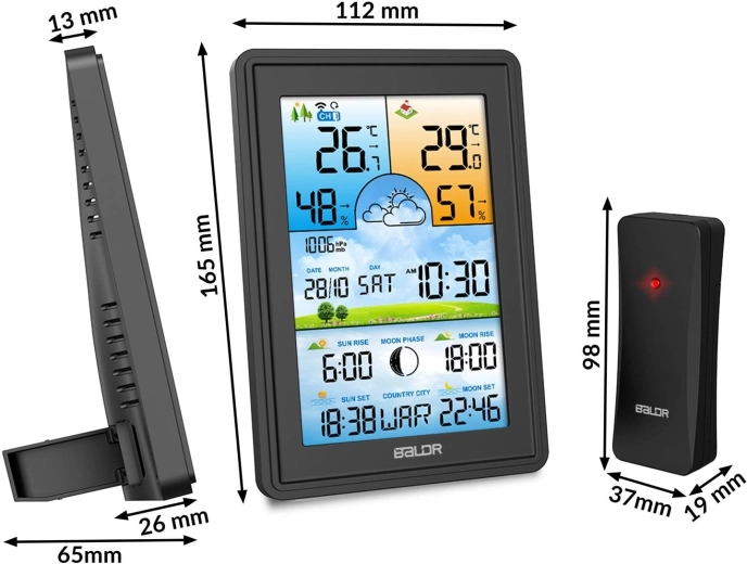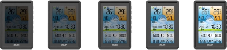 Velký barevný LCD displej zobrazuje vnitřní i venkovní teplotu a vlhkost, barometrický tlak a ikony vývoje počasí. Nechybí fáze Měsíce a časy východu a západu Slunce i Měsíce. Podsvícení lze přizpůsobit ve 4 krocích (100/50/10/3 %) nebo zcela vypnout. Bezdrátové čidlo s dosahem až 60 m zajišťuje stabilní přenos údajů a možnost rozšíření o další senzory.