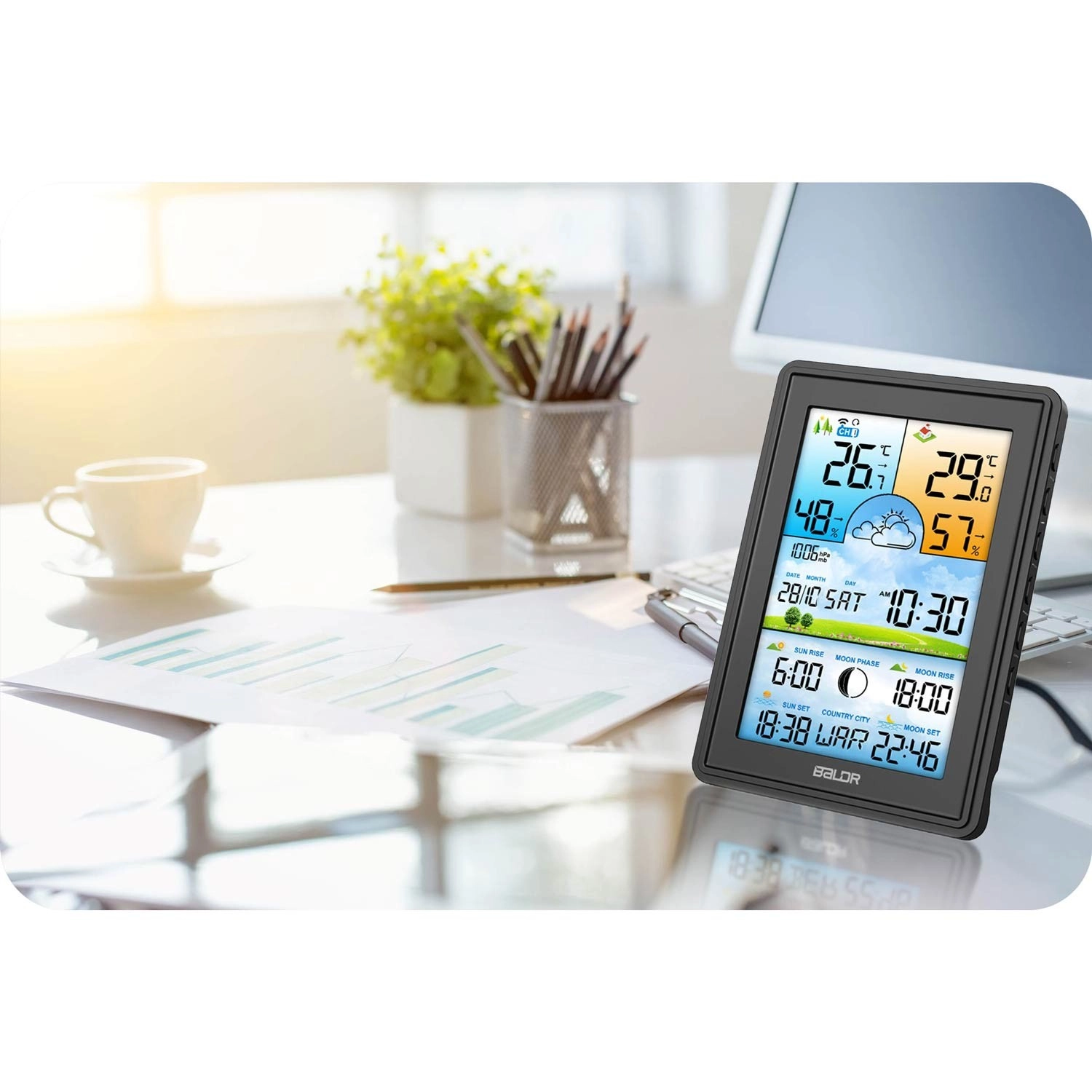 Zobrazí čas řízený DCF77, datum a kalendář, fáze Měsíce i časy východu a západu Slunce a Měsíce. Ideální informační centrum pro celou domácnost.