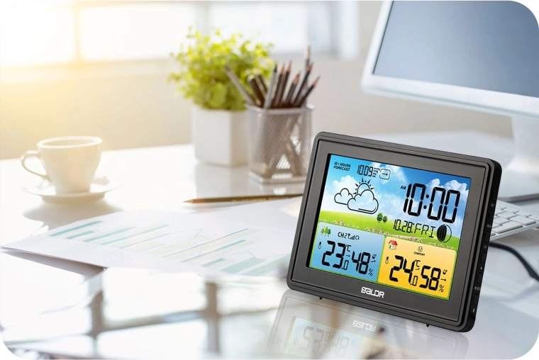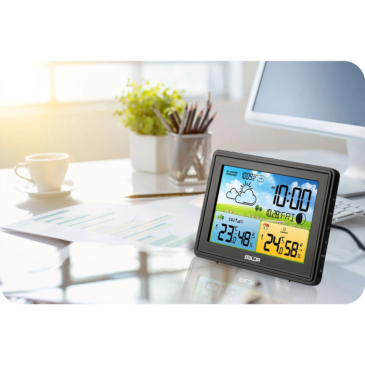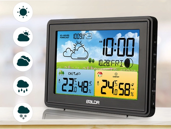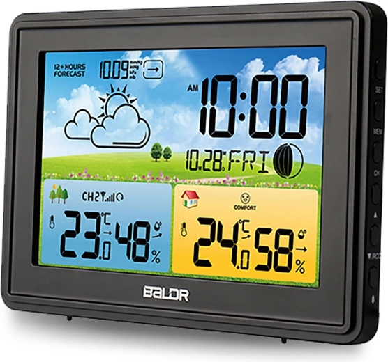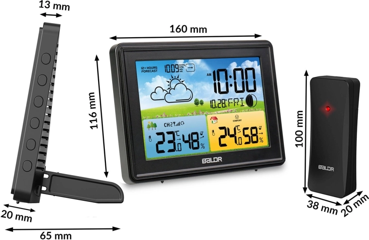 Bezdrátový venkovní čidlo (dosah až 60 m) přenáší aktuální hodnoty, které se zobrazují vedle údajů z vnitřních senzorů. Přehledný barevný LCD s 3 úrovněmi podsvícení (100 %, 60 %, 5 %) nebo zcela bez podsvícení zaručuje pohodlné čtení i v noci. Nechybí ukazatel komfortu, fáze Měsíce, budík a funkce drzemí, stejně jako indikace stavu baterie pro stanici i senzor.