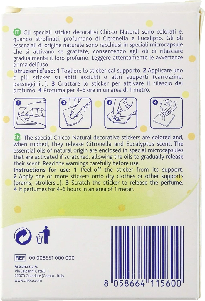 Chraňte sebe i své děti před obtěžujícím hmyzem s přírodními parfémovanými nálepkami Chicco. Díky esenciálním olejům (citrónová tráva a eukalyptus citriodora) a mikrokapslím se vůně uvolňuje pozvolna po aktivaci třením. Nálepky jsou ideální pro venkovní aktivity, výlety i každodenní použití.