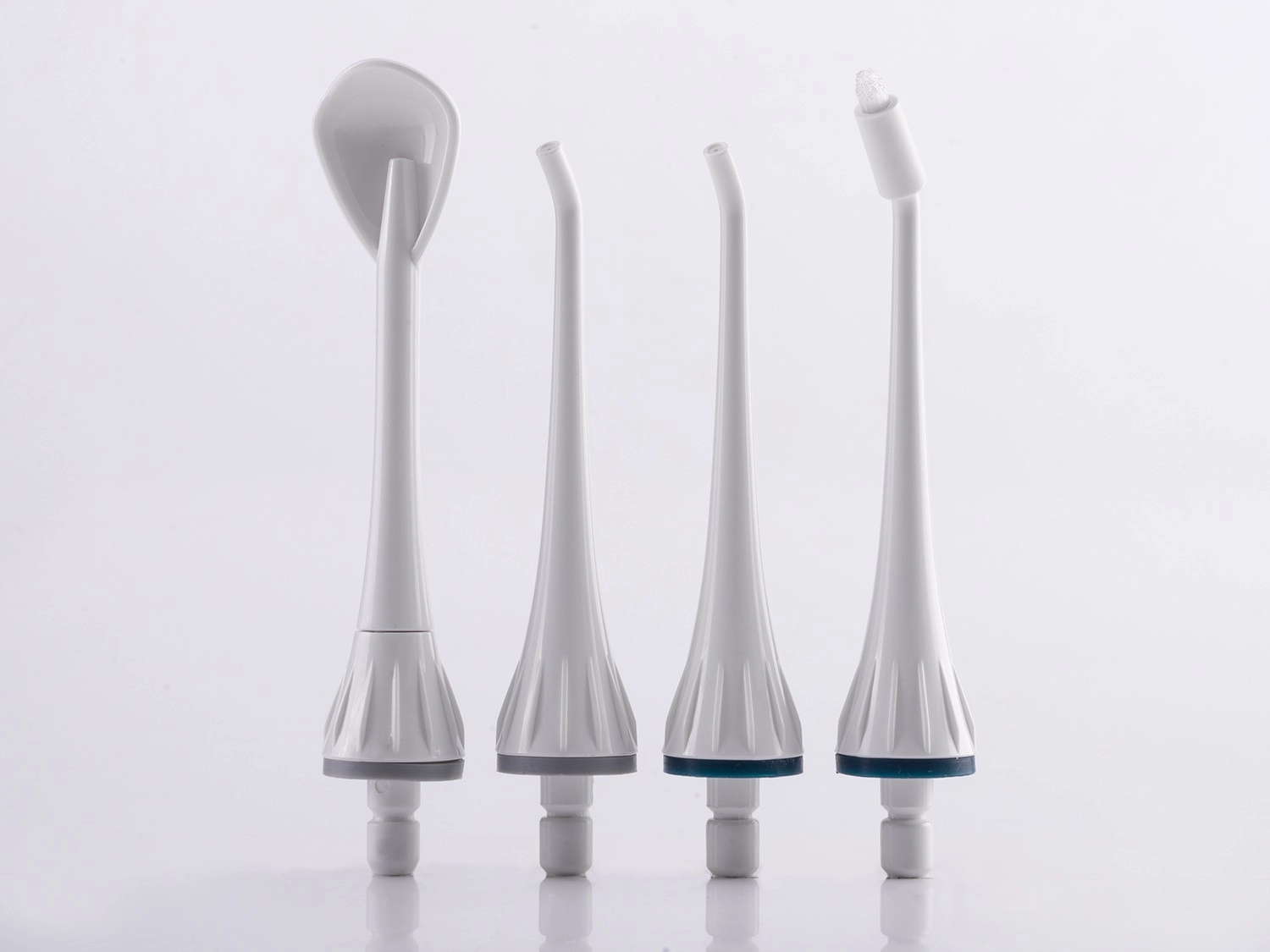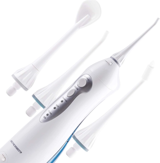 V balení 4 specializované trysky s otočením 360° pro maximální dosah: dvě standardní trysky, škrabka na jazyk pro svěží dech a ortodontická tryska pro důkladné čištění kolem rovnátek a korunek.
