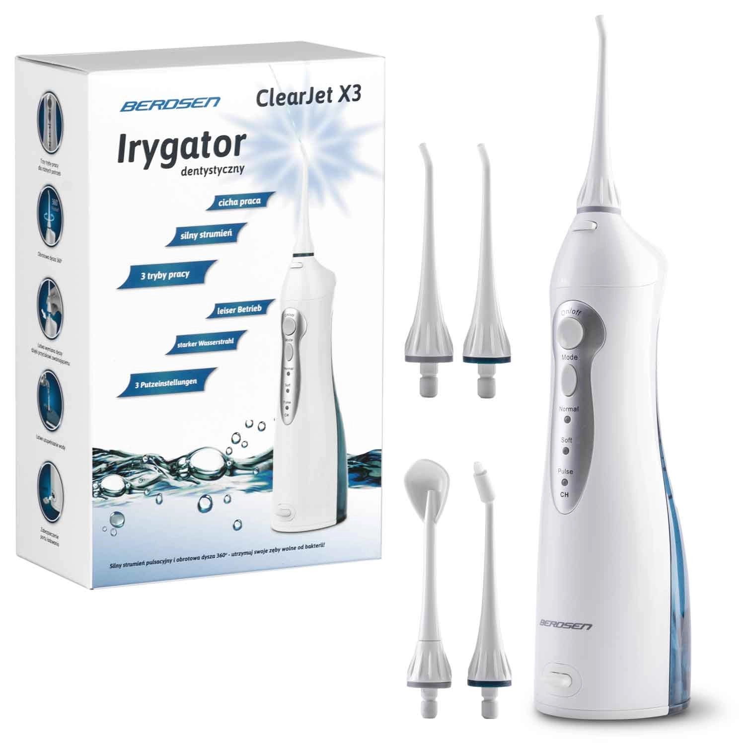 Profesionální péče o ústní dutinu kdykoli a kdekoli. Irigátor BERDSEN ClearJet X3 účinně odstraňuje plak, zbytky jídla a bakterie z míst, kam se klasický kartáček nedostane. Je ideální pro čištění mezizubních prostor, rovnátek, implantátů a korunek. Tři režimy výkonu vám umožní přizpůsobit proud vody vašim potřebám – od jemné péče pro citlivé dásně po intenzivní pulzní masáž pro maximální svěžest.