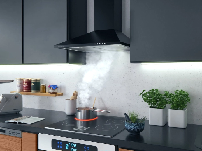 Matná černá nerez, čisté linie a komínová konstrukce se dvěma vysouvacími kryty elegantně doplní moderní interiéry a spotřebiče.