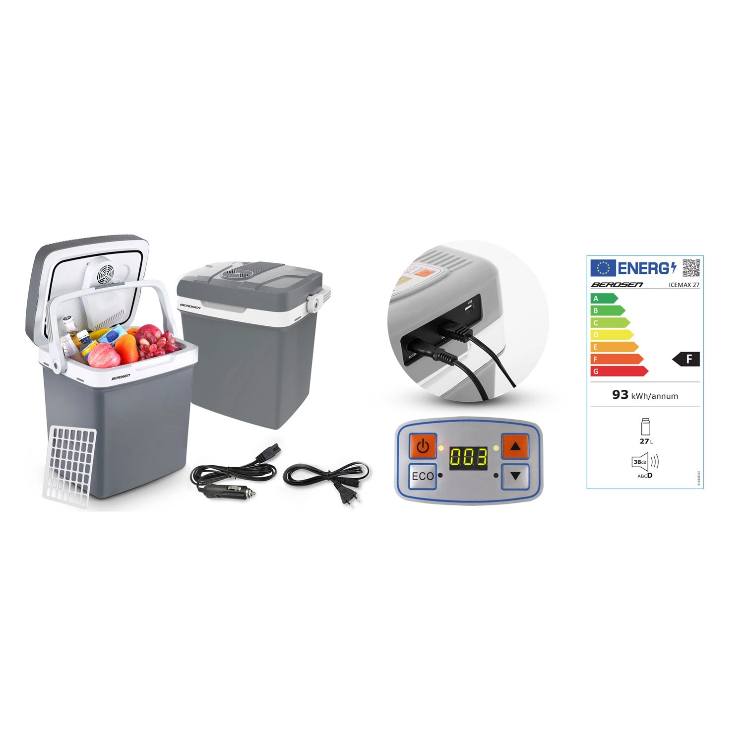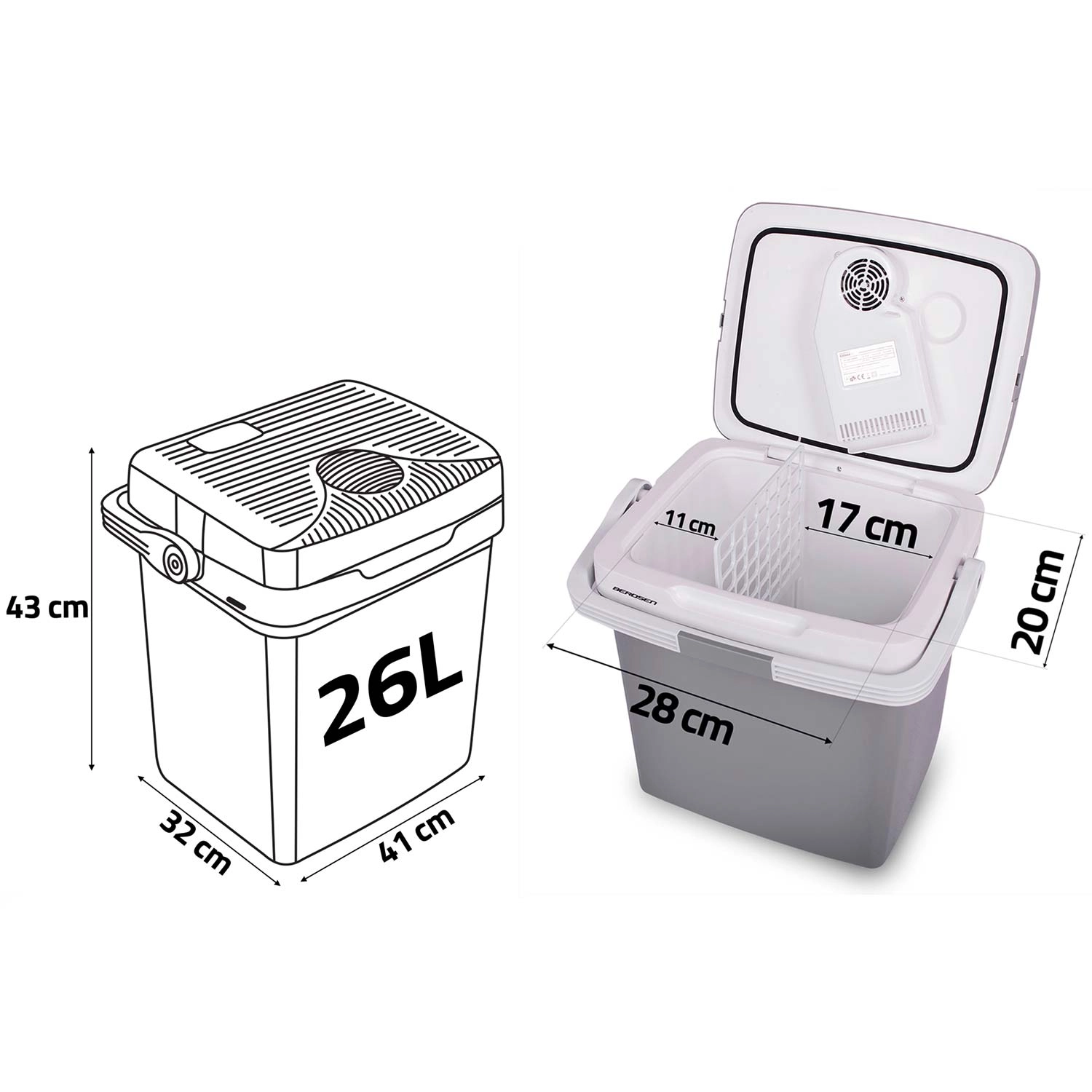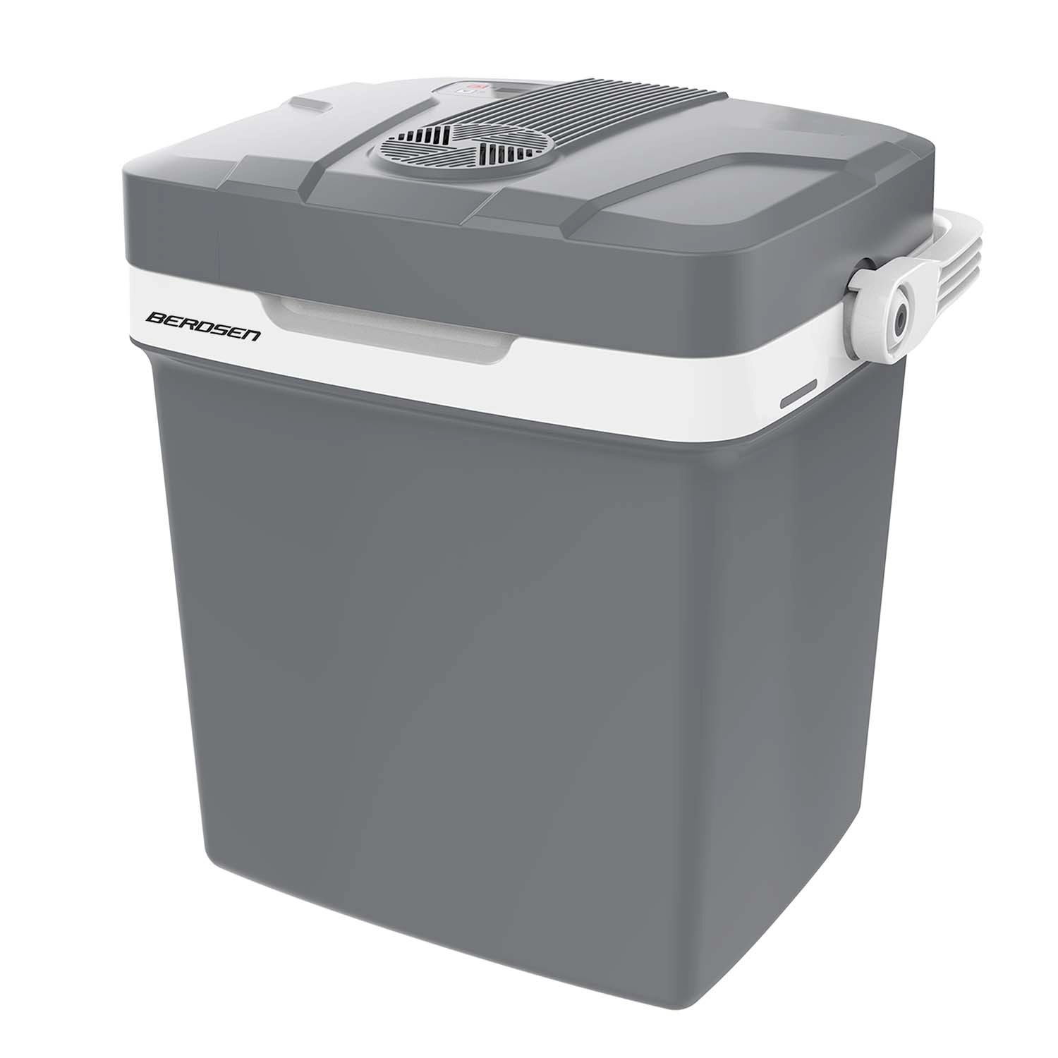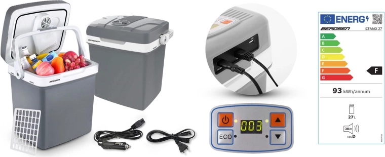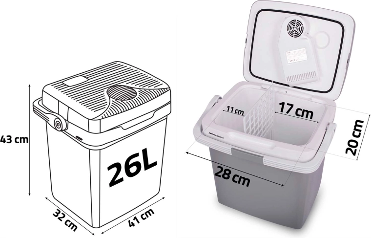 Díky napájení 12 V (auto) i 230 V (síť) je připravena k použití kdekoli. Integrovaný ventilátor cirkuluje vzduch pro rovnoměrné chlazení obsahu a těsnění víka s praktickou pojistkou rukojeti pomáhá držet stabilní teplotu. Součástí je rozdělovací mřížka pro lepší organizaci potravin – ideální na ovoce, nápoje či svačiny.