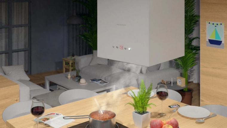 Kompaktní krychlové tělo v bílé oceli se zavěšením na lankách šetří prostor a elegantně doplňuje minimalistická a otevřená kuchyňská řešení.