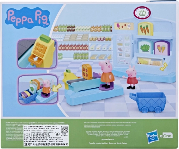 Scéna supermarketu nabízí ledničku a otočné karty, díky nimž děti objevují různé druhy zboží. Realistické funkce podporují rozvoj jemné motoriky, představivosti a role-play her s oblíbenými hrdiny ze seriálu Prasátko Peppa.