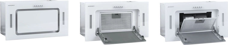 - Minimalistický design: bílé provedení se skleněným panelem, nenápadné provedení pod skříňku