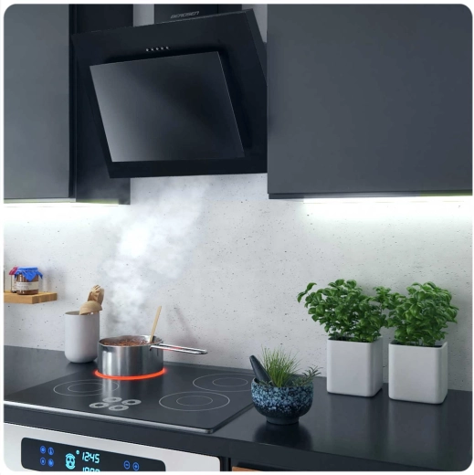 Stylový a funkční odsavač par pro moderní kuchyně. Přední skleněná černá deska z tvrzeného skla dodá varné zóně prémiový vzhled, zatímco tiché a efektivní odsávání odstraní páru, mastnotu i pachy. Díky volbě odtahu do komína nebo recirkulace s uhlíkovým filtrem se snadno přizpůsobí dispozici vaší kuchyně.