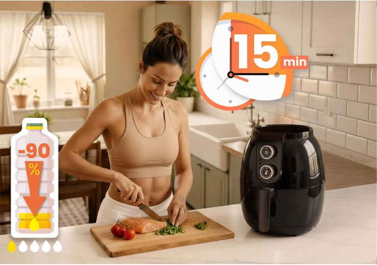Pokročilá cirkulace horkého vzduchu zajistí zlatavou kůrku a šťavnaté vnitřky s až o 90 % méně tuku. Skvělé pro hranolky, kuře i zeleninu.