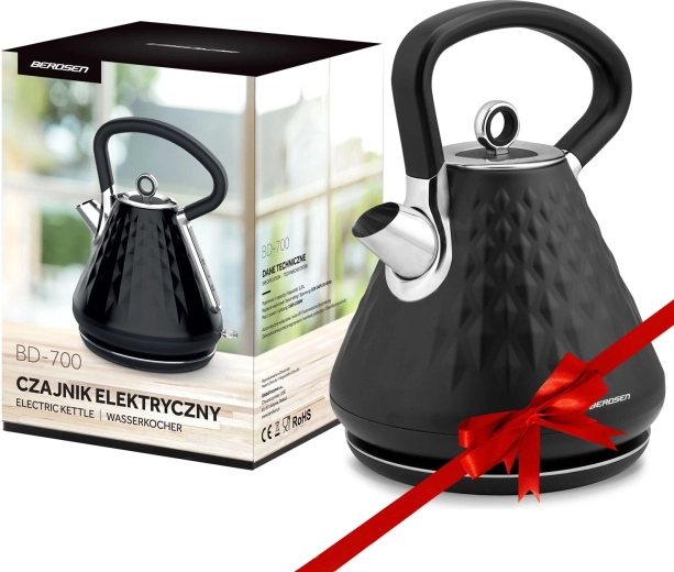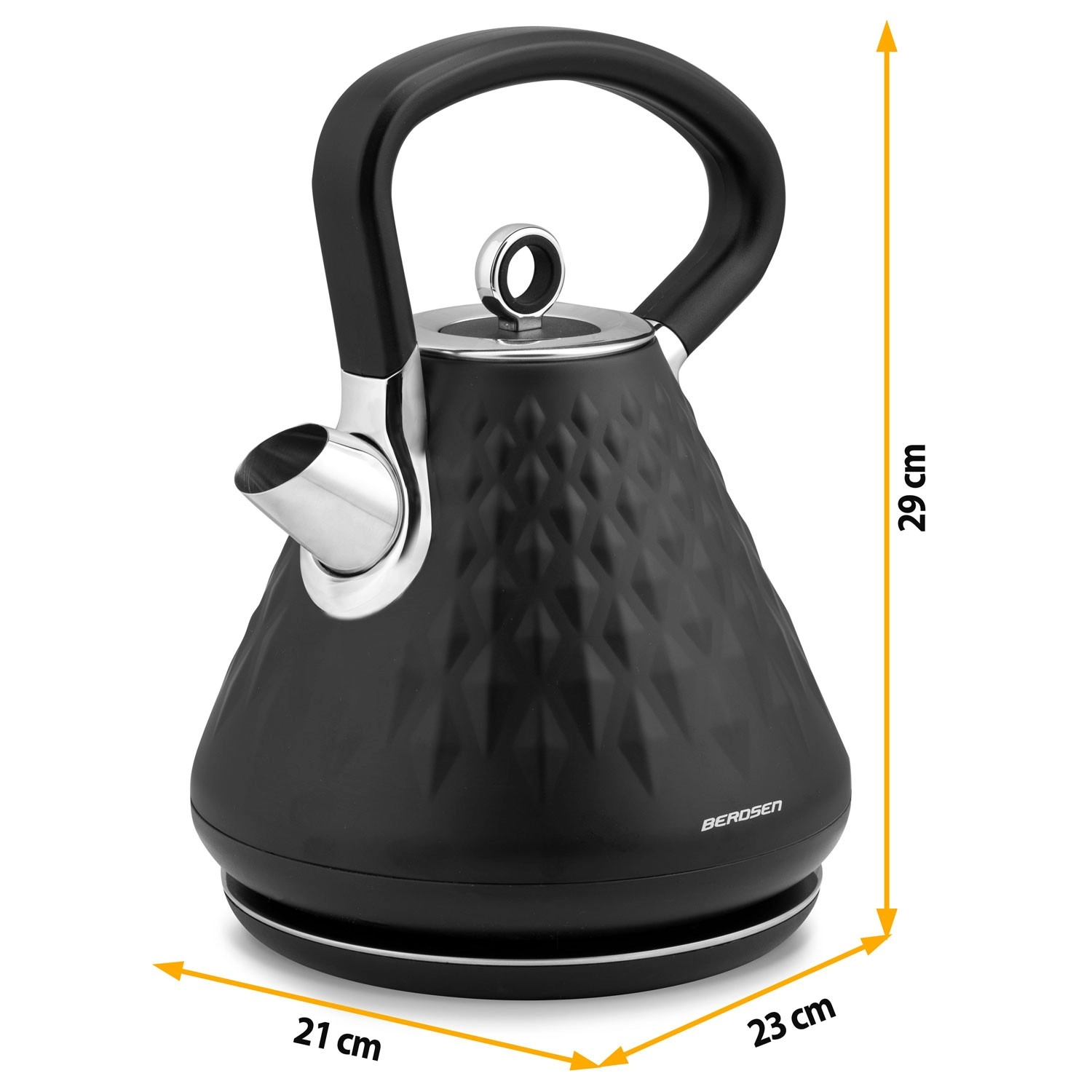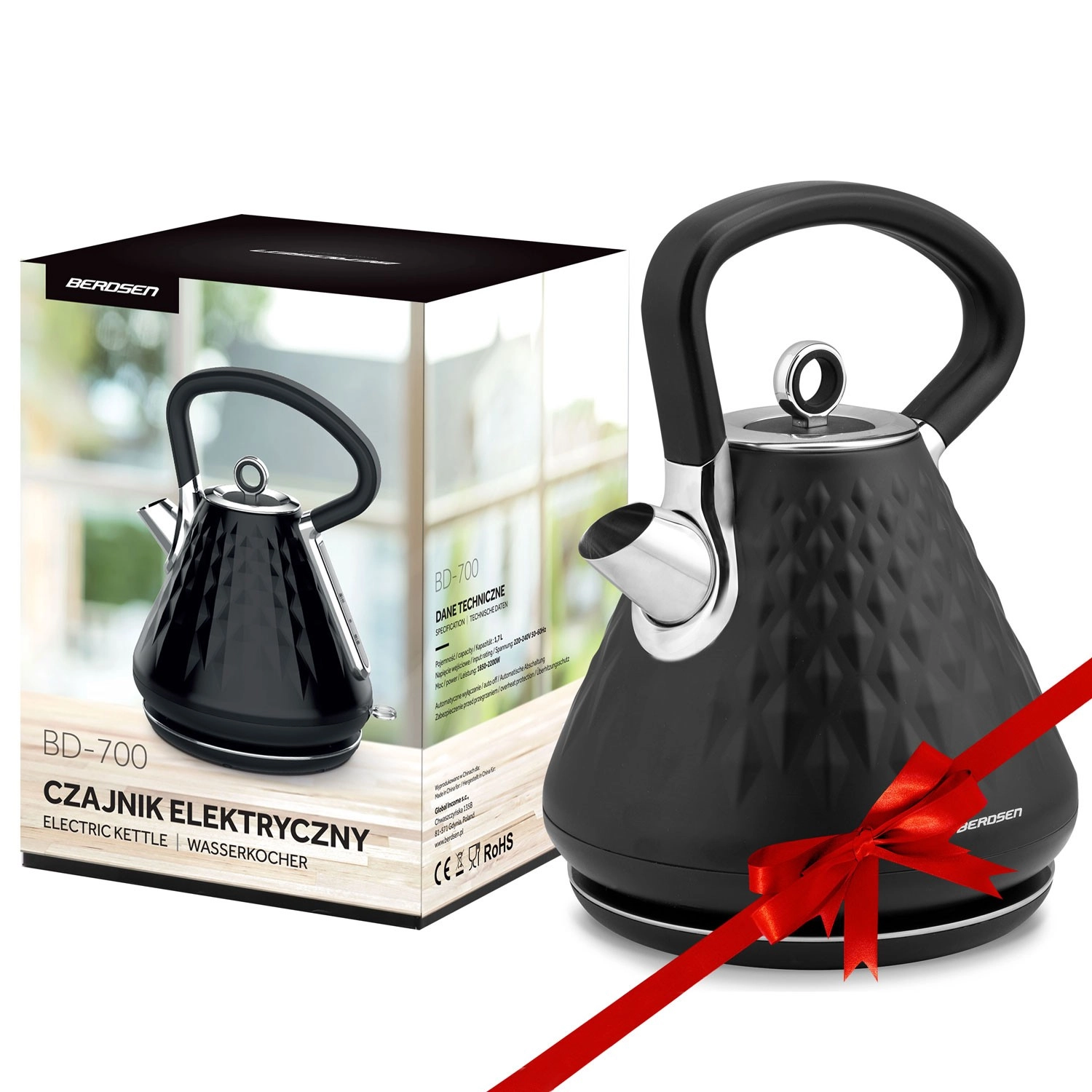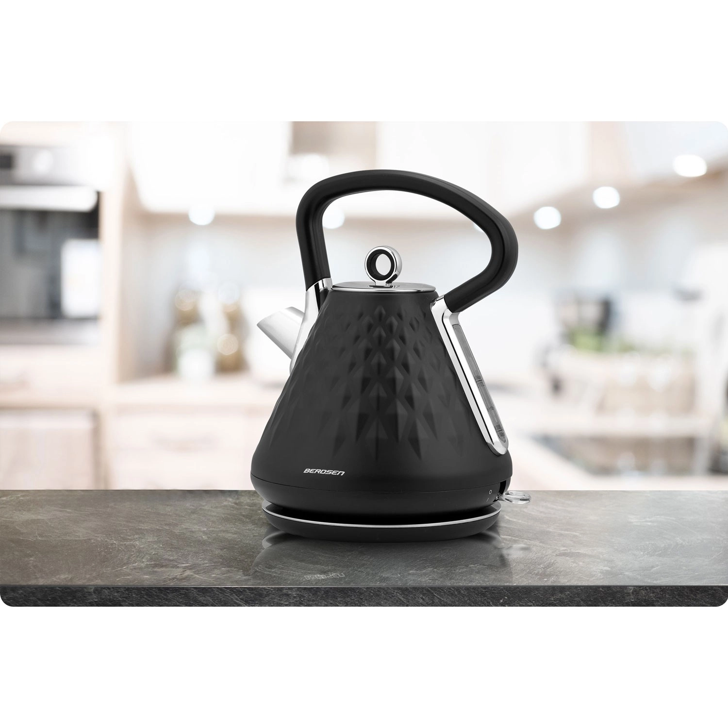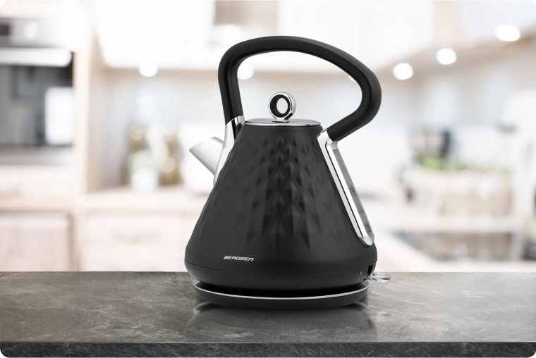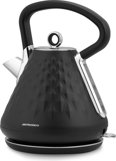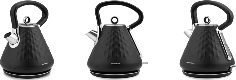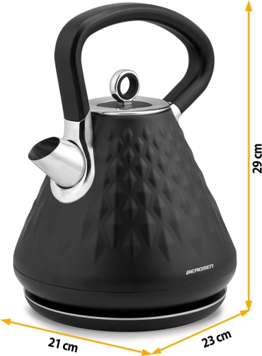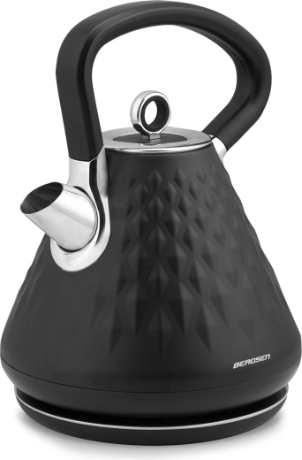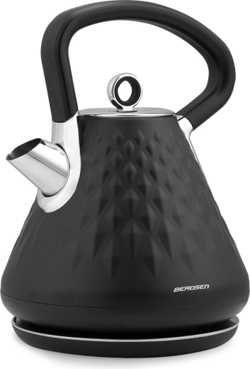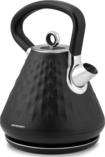 Konvice Berdsen s kovovým tělem a elegantním matným povrchem s prostorovým reliéfem se stane ozdobou každé kuchyně. Díky příkonu 1850–2200 W přivede vodu k varu během chvilky, zatímco 360° otočná základna a skrytý prostor pro kabel zaručují maximální pohodlí na pracovní desce.