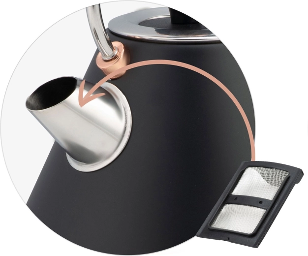 Konvice nabízí rychlý ohřev o výkonu 1850–2200 W, 360° otočnou základnu pro praváky i leváky a praktický schovek na kabel. Anti‑vápenný kovový filtr ve výlevce zachytí usazeniny, zatímco ochrana proti chodu na sucho a podsvětlený vypínač zvyšují bezpečnost a komfort.