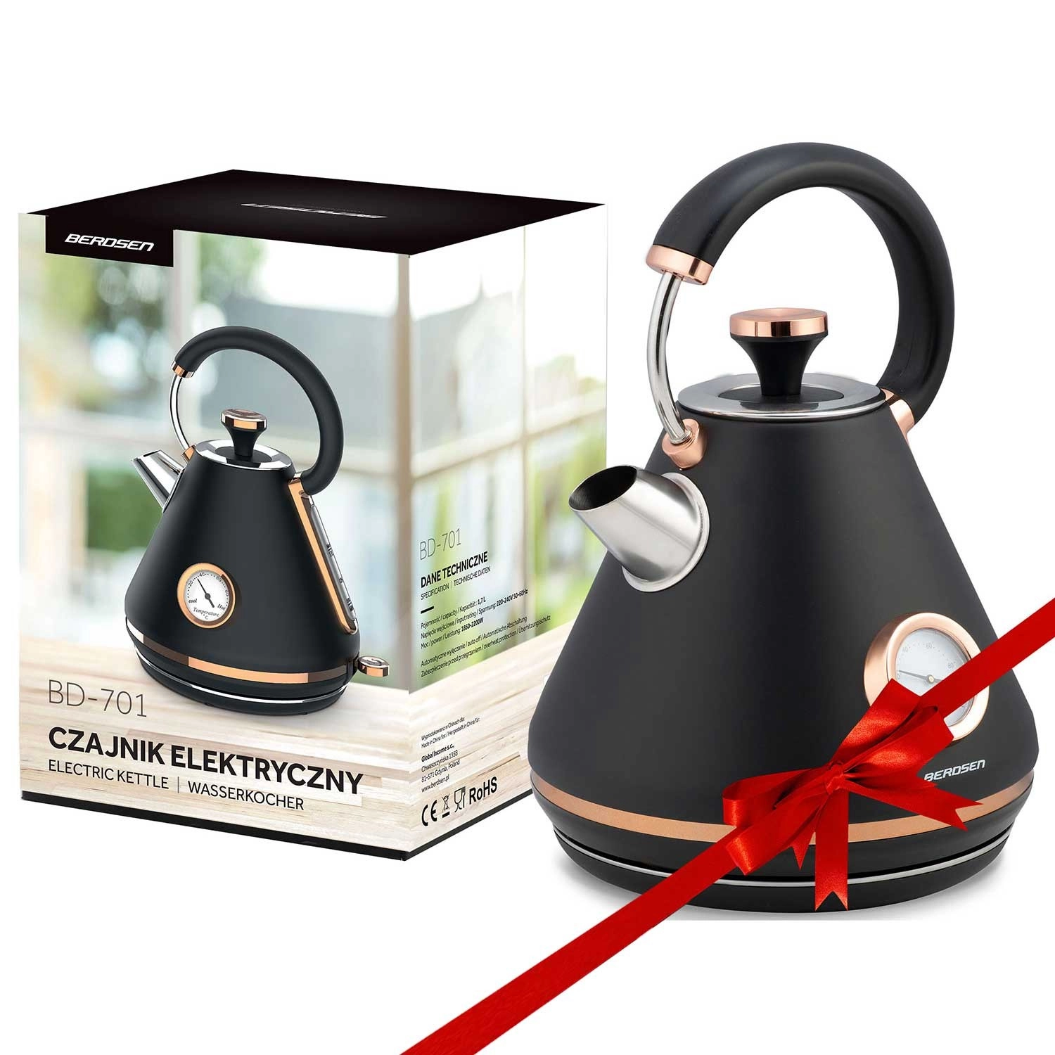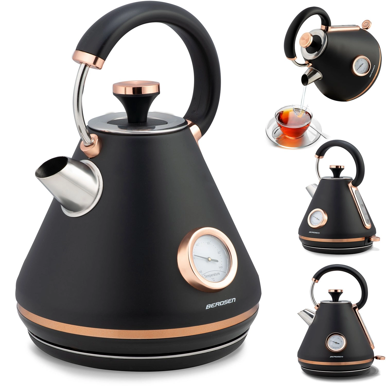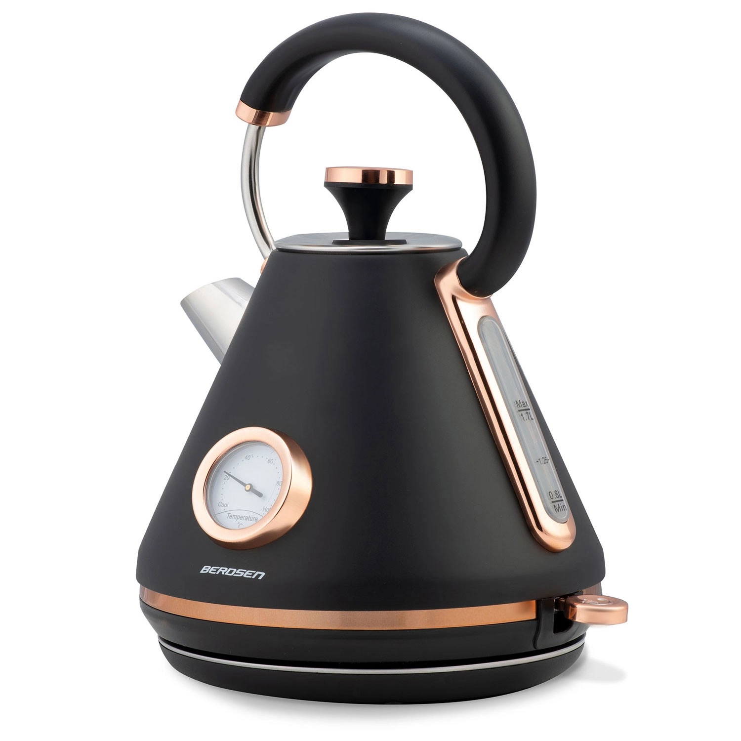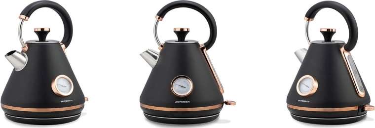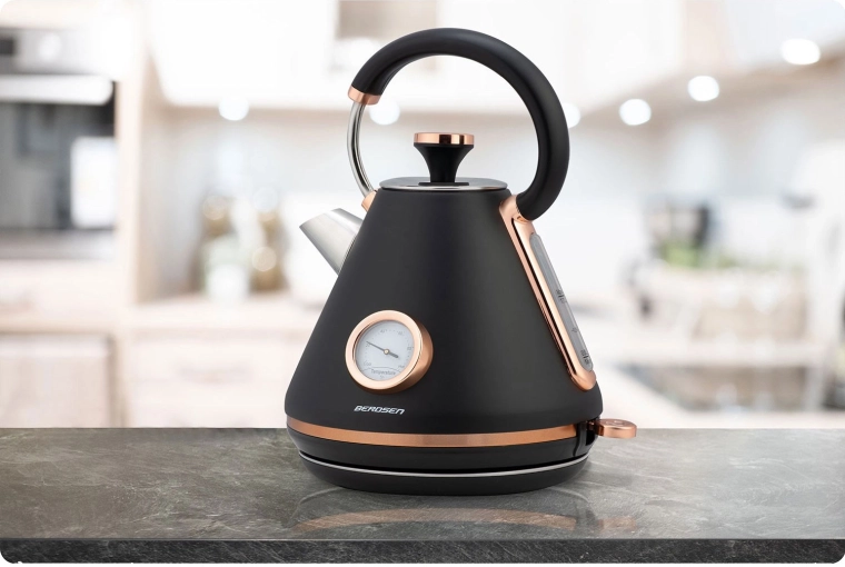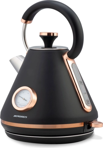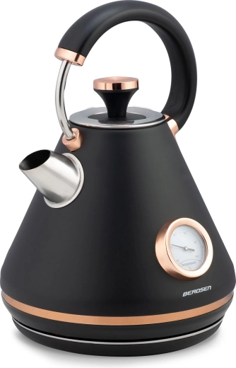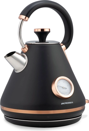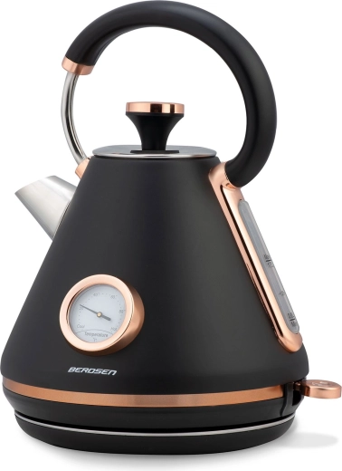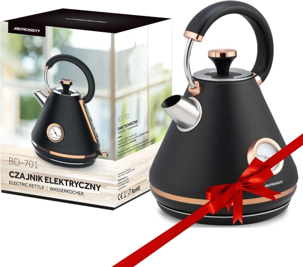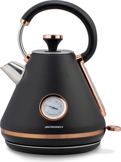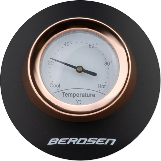 Stylová retro konvice Berdsen 1,7 l s integrovaným analogovým teploměrem pro přesnou přípravu čaje i kávy. Nabízí kovové tělo s matným povrchem, 360° otočnou základnu, podsvětlený vypínač, nepřehřívající se rukojeť a vyjímatelný anti‑vápenný filtr pro čistší vodu. Praktická odnímatelná poklička, ukazatel hladiny vody a protiskluzové nožičky zajišťují pohodlné a bezpečné používání.