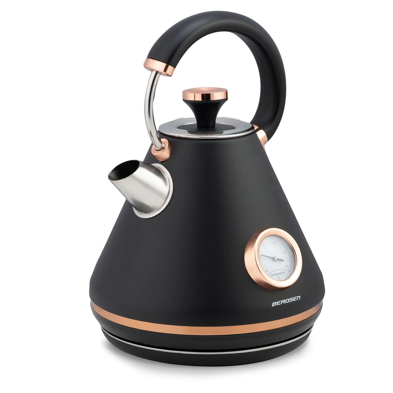 Obohaťte svou kuchyň o elegantní retro konvici Berdsen s objemem 1,7 l. Díky vestavěnému teploměru snadno zvolíte ideální teplotu pro zelený čaj, kávu i bylinkové nápoje. Matné kovové provedení se snadno udržuje a dodá interiéru prémiový vzhled.