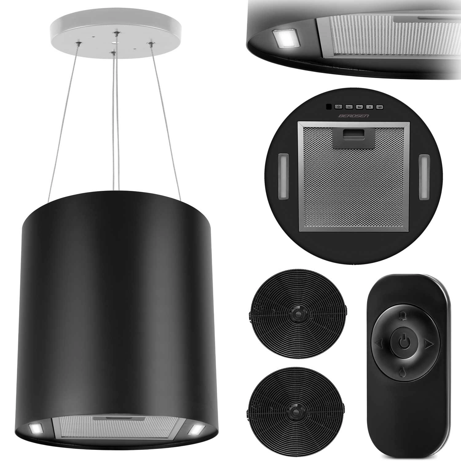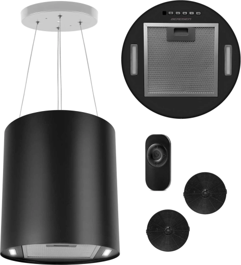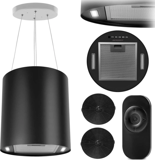 Designový válcový odsavač par na lanku vyniká kompaktními rozměry a prémiovým zpracováním. Černá ocelová konstrukce je odolná vůči vysokým teplotám a snadno se udržuje. Odsavač pracuje v režimu recirkulace s dodanými uhlíkovými filtry, takže účinně pohlcuje pachy i v kuchyních bez odtahu.