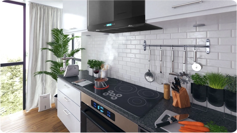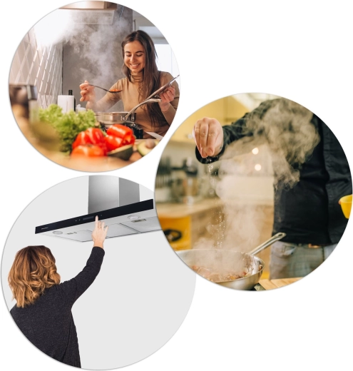Přehledný dotykový panel pro pohodlné nastavení a tři 3vrstvé hliníkové filtry pro spolehlivé zachycení mastnoty a jednoduché čištění.