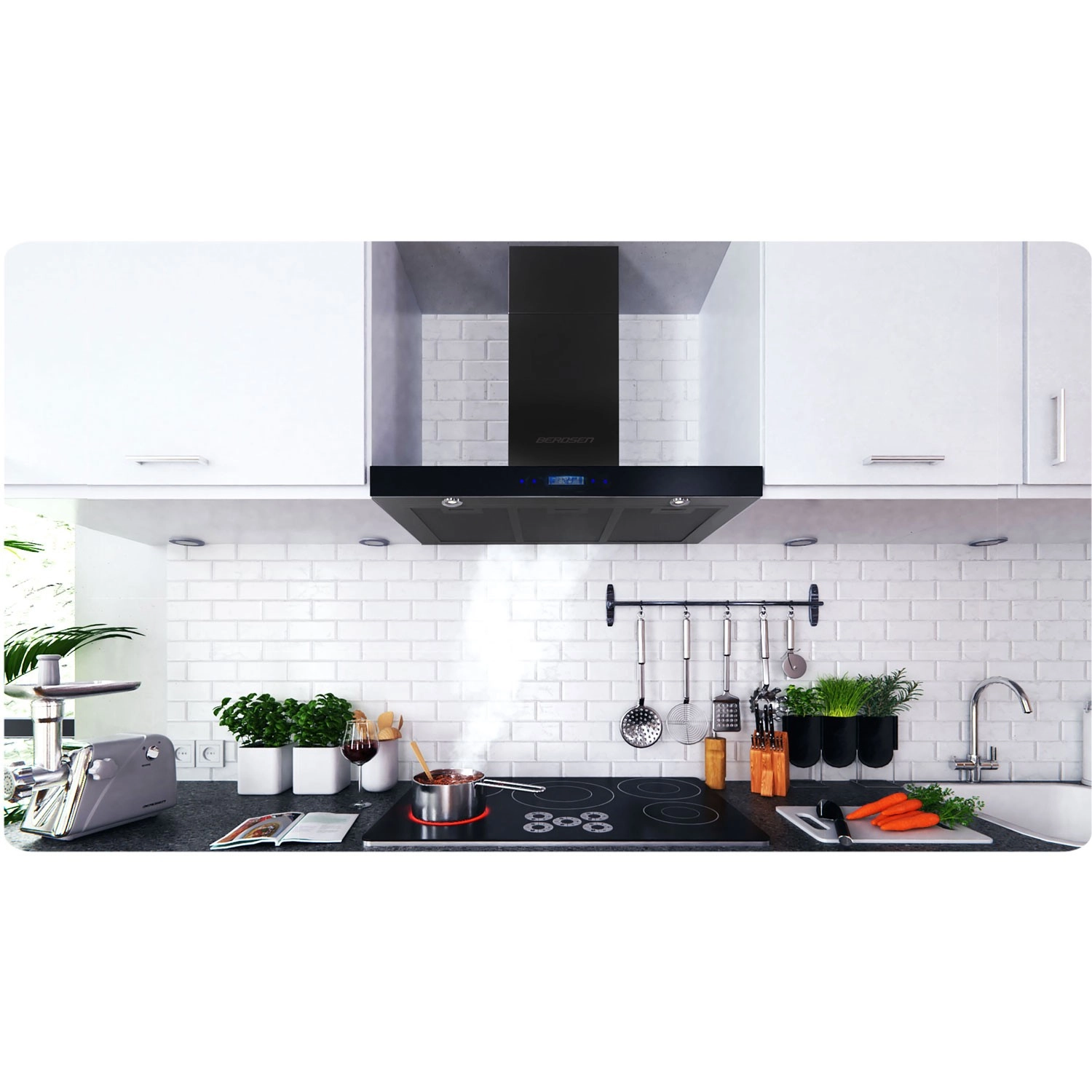 Moderní odsavač par Berdsen 90 cm v černém provedení se skvěle hodí do současných kuchyní. Díky silnému motoru s příkonem 160 W a výkonu až 750 m³/h účinně odstraní páru, kouř i pachy. Intuitivní dotykový panel usnadňuje obsluhu a LED světla (2 × 1 W) šetří energii a zároveň příjemně osvětlují pracovní plochu.