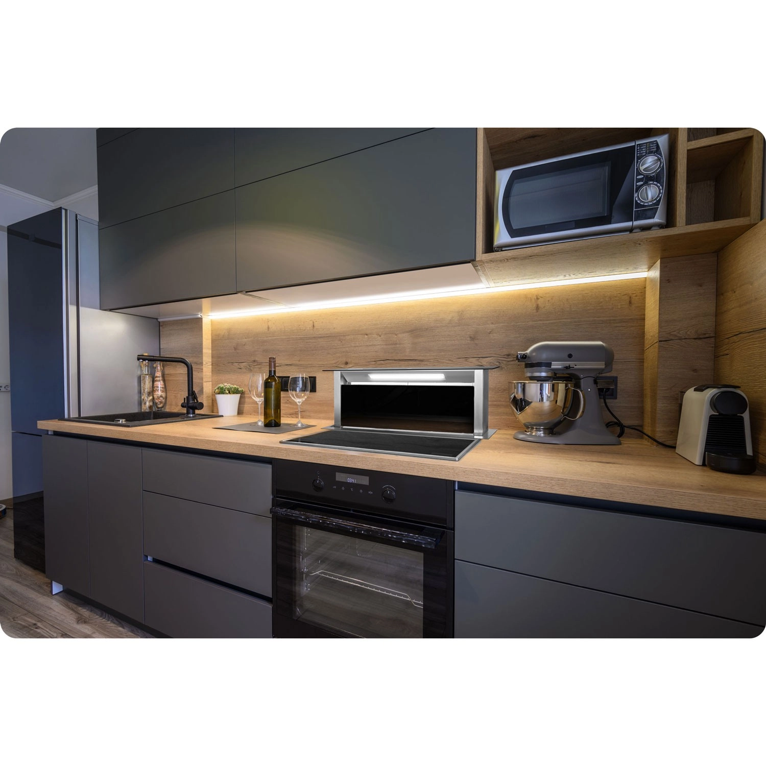 Výsuvný odsavač do desky je ideální volbou pro moderní kuchyně, ostrůvky i individuální projekty, kde chcete mít výkonné odsávání bez rušení designu. Díky velké ploše sání a tichému chodu až 62 dB účinně eliminuje vlhkost, pachy i mastnotu, zatímco LED osvětlení 3 W perfektně nasvítí plochu vaření.